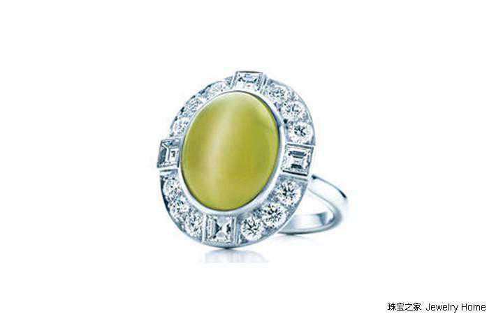 TiffanyCo.蒂芙尼猫眼石戒指,绿色,铂金镶钻石,宝石呈现乳白—蜜黄色效果要想挑选品质佳的猫眼石,MissJ+建议你从以下方面考虑: