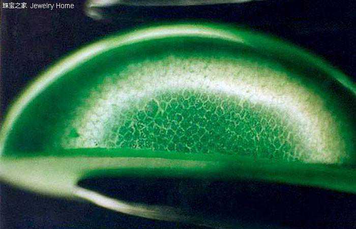 玻璃猫眼,放大检查,在宝石侧面垂直光带方向,可见蜂窝状结构玻璃在宝石界真是个神奇的物种,啥啥都能仿,但其颜色过于鲜艳,不同于天然宝石的颜色,眼线不自然。放大镜下观察,在垂直于猫眼亮带方向,用光纤灯或手电筒照射可见六边形蜂窝状结构,这一点是决定性也是最快速的鉴定依据。