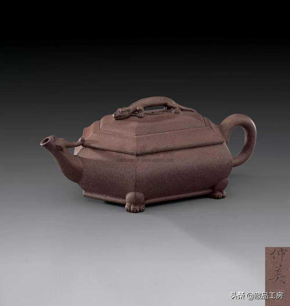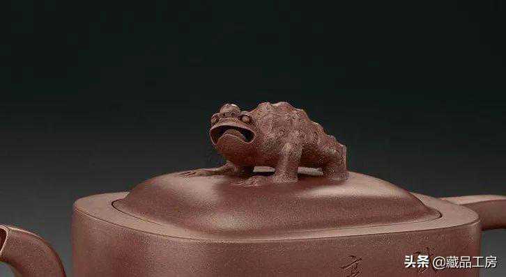此壶呈圆角长方型,坡状壶盖设三足蟾蜍钮,不论身筒、壶流、壶把皆方中有圆,圆中寓方,整体比例得当,气韵珠圆玉润。