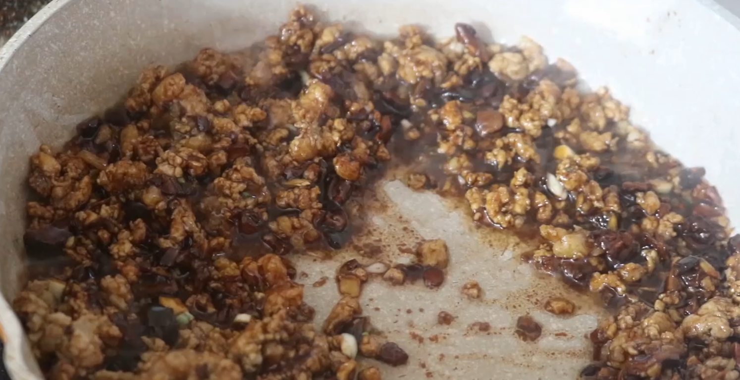 6、锅中加入一勺食盐,一勺生抽,适量的老抽,一勺蚝油,一勺白糖,翻拌均匀,一直炒到肉末上色。翻炒出香味之后下入一勺黄豆酱,继续翻炒,将黄豆酱也翻炒出酱香味,然后加入香菇水,大火煮15分钟,让香菇,黄豆酱,猪肉的香味融合在一起。翻炒至汤汁浓稠就可以了,咱们出锅装入盘中。