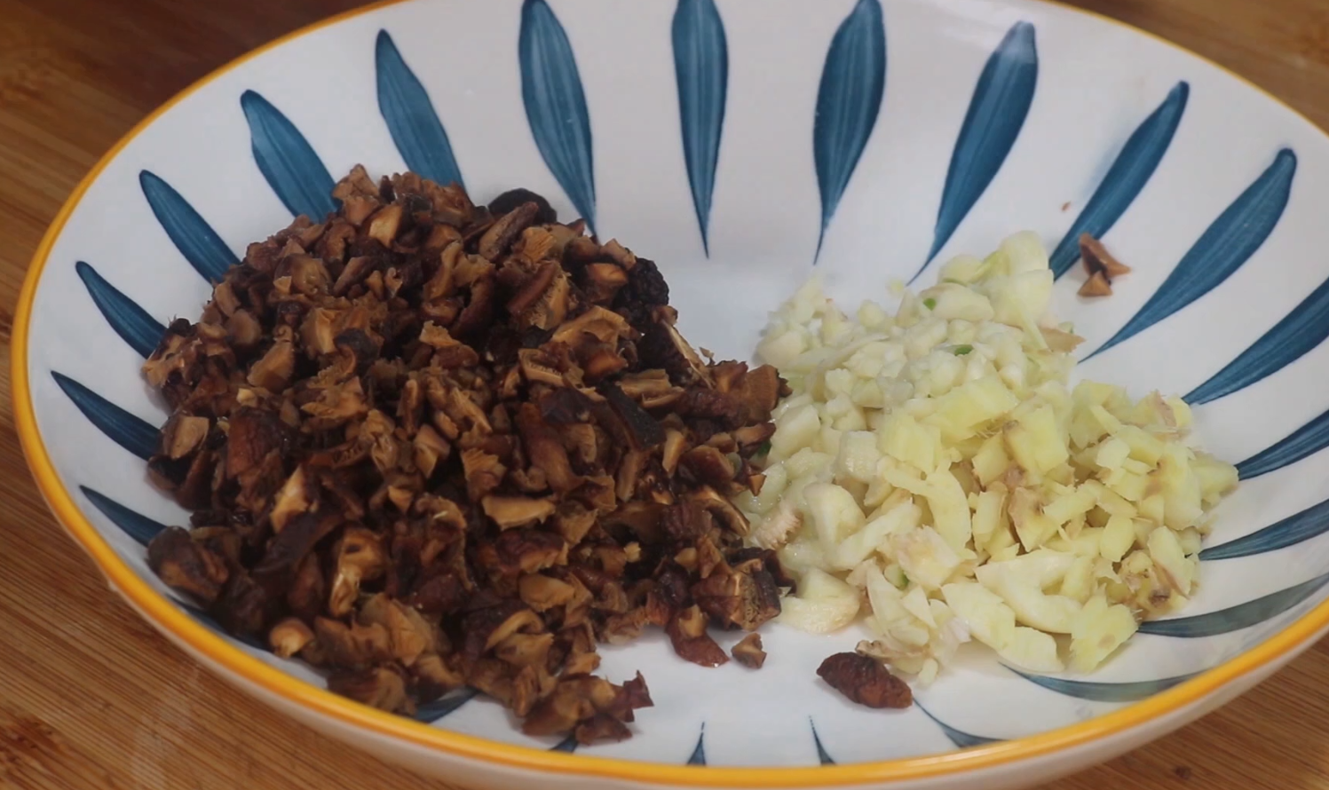 4、将剁好的猪肉放到一个盘中,然后再把大蒜取出来,将大蒜去外皮拍碎,然后切末,再将生姜切丝后切末,全部放到盘中备用。等到咱们切完大蒜和生姜之后香菇就已经泡发好了,将泡发好的香菇放在手中用力挤干水分,然后放到案板上。