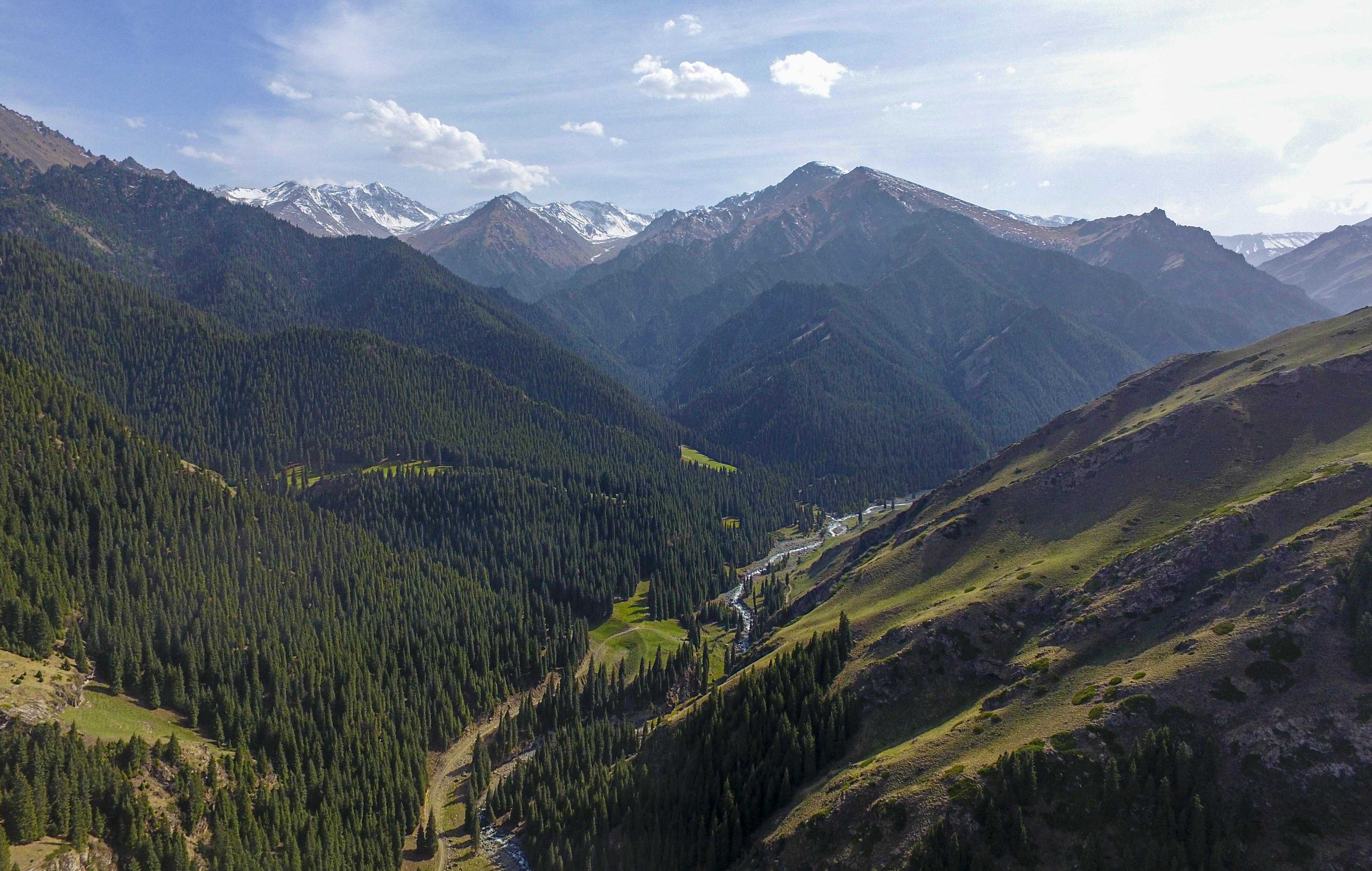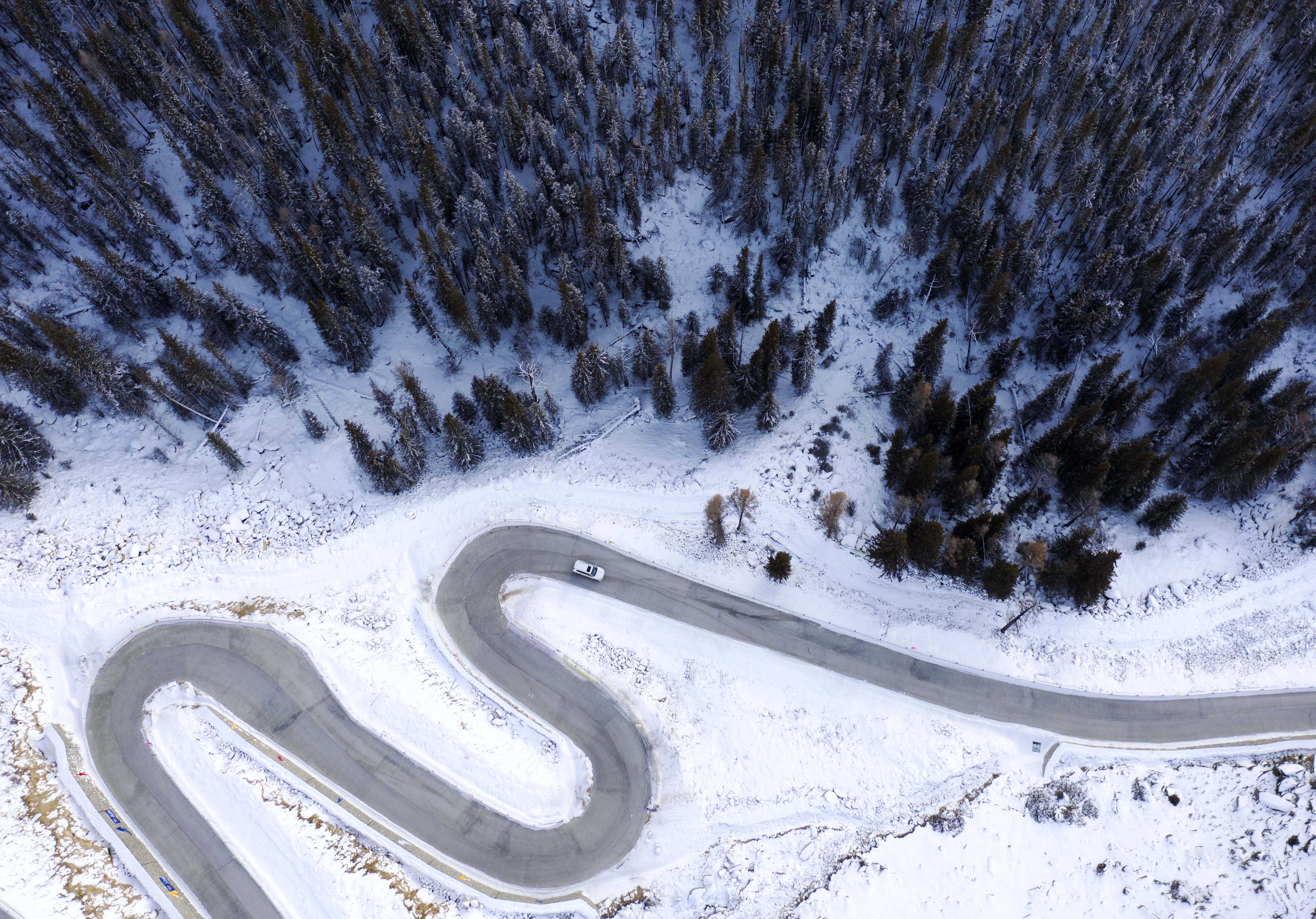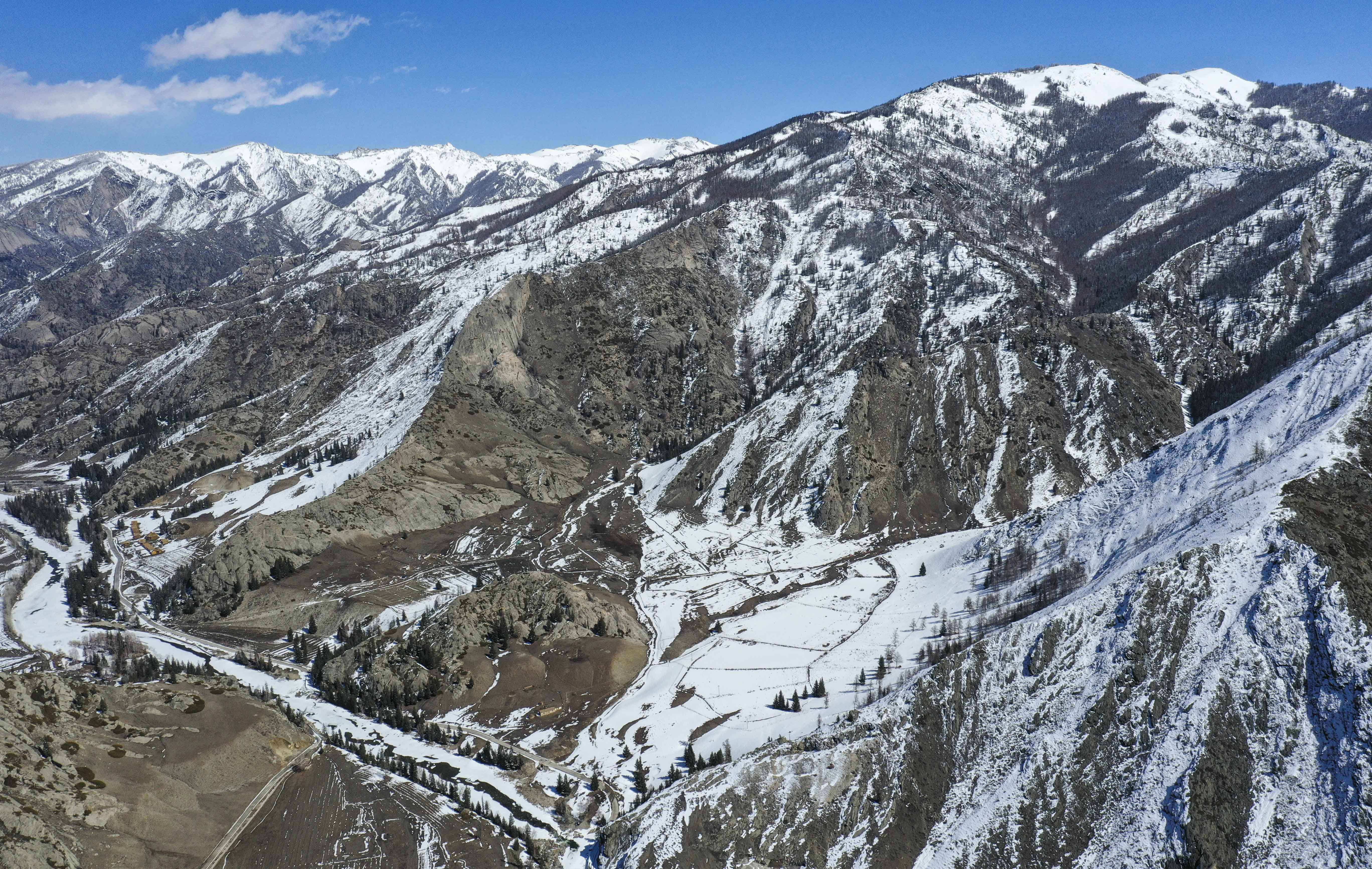 春雪过后的阿尔泰山脉(无人机照片,2023年4月9日摄)。新华社记者胡虎虎摄