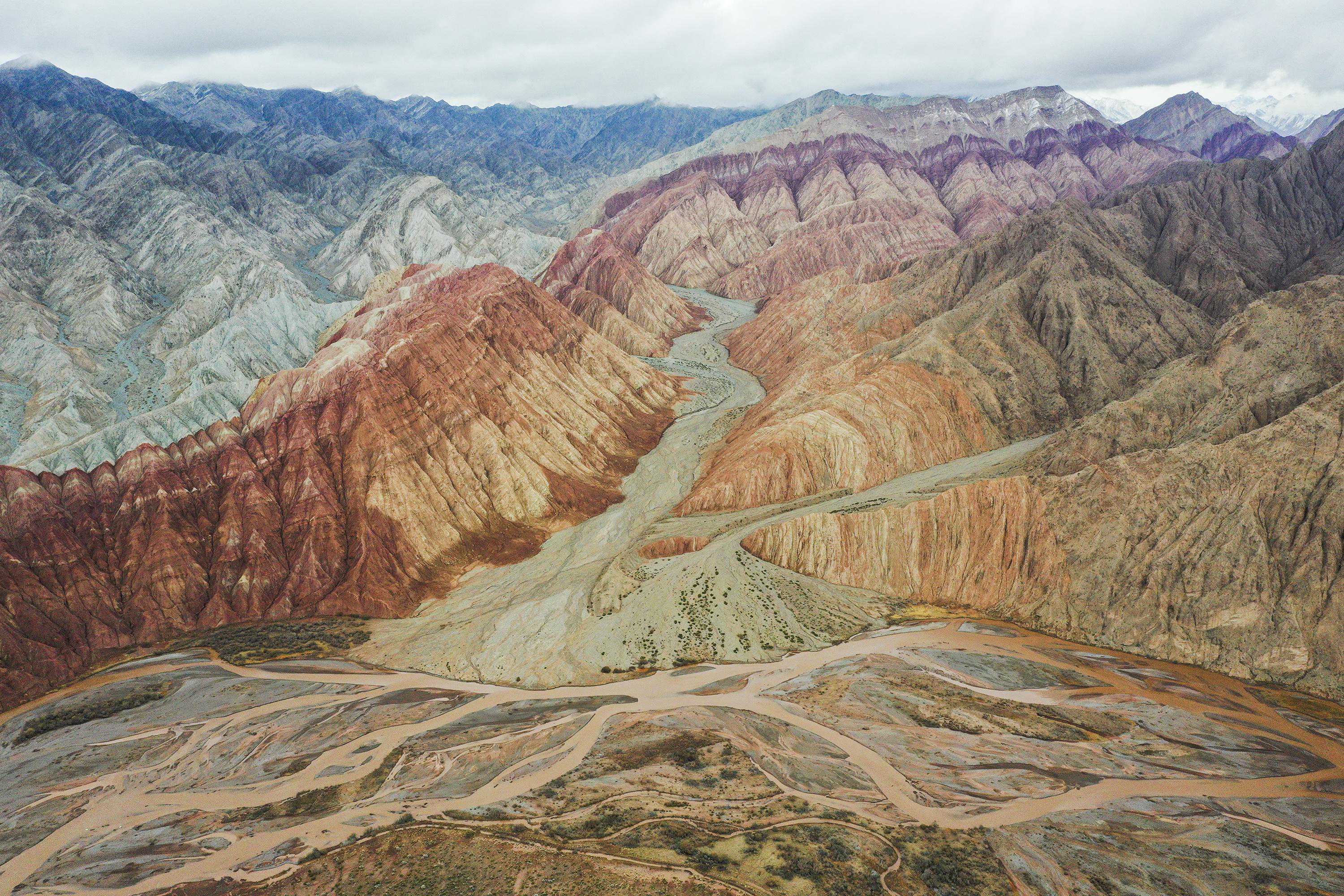 天山-昆仑山交汇处色彩斑斓,风景如画(无人机照片,2023年4月26日摄)。新华社记者郝昭摄