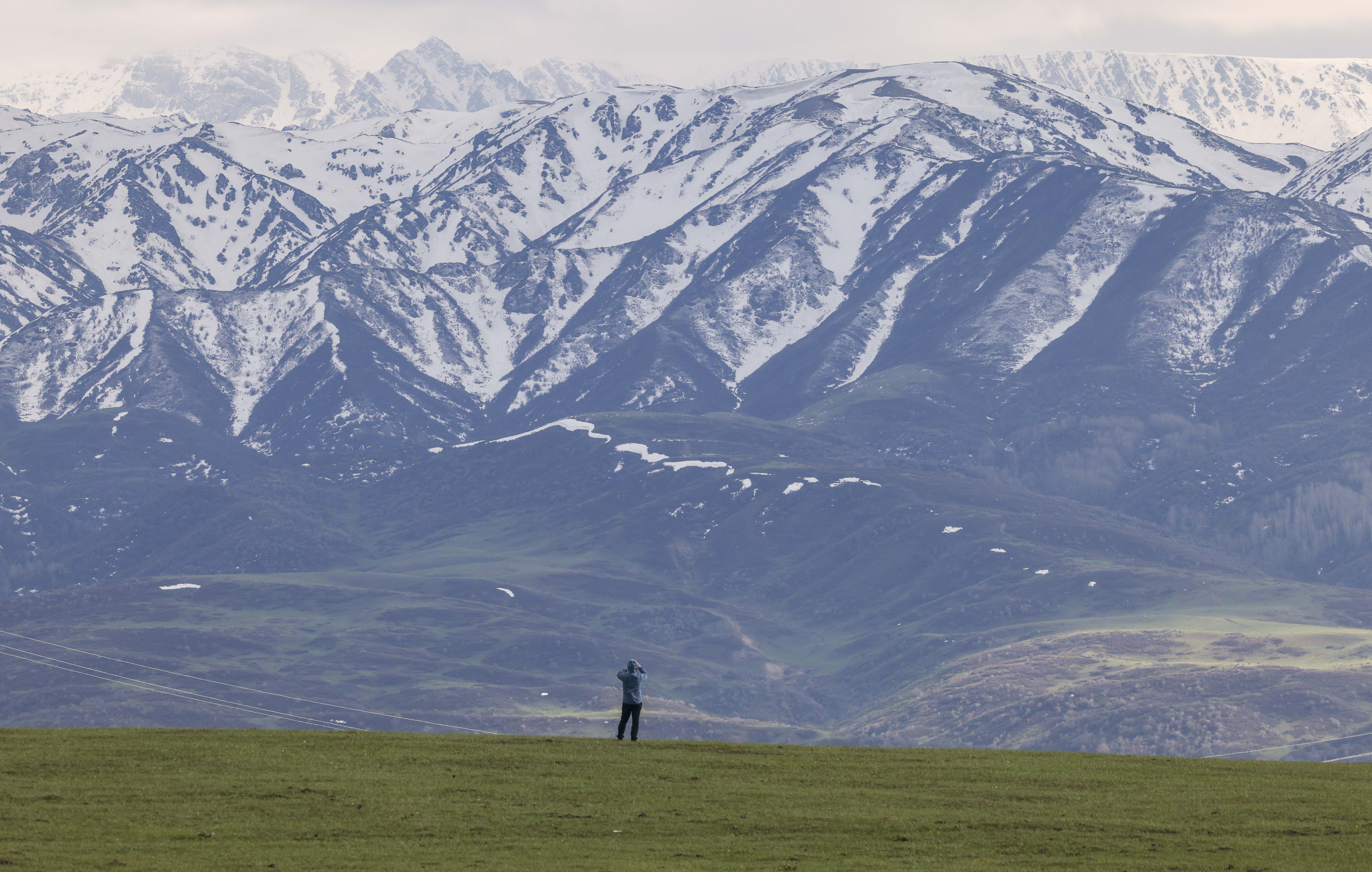 游客在新疆塔城地区裕民县巴尔鲁克山区拍摄风景(2023年5月2日摄)。新华社发(张度摄)
