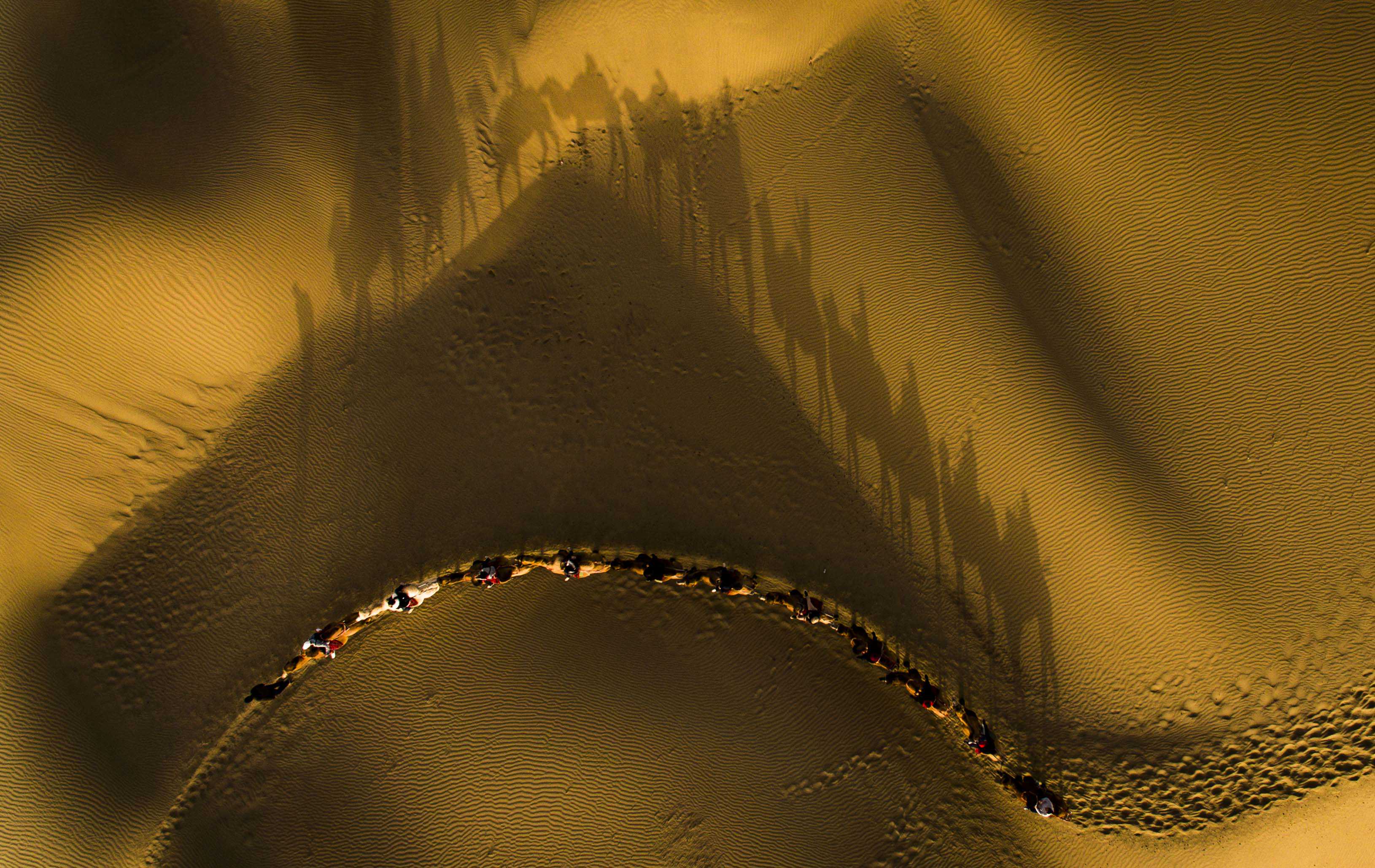 游客骑着骆驼在新疆尉犁县罗布人村寨内欣赏沙漠美景(无人机照片,2019年10月26日摄)。新华社记者赵戈摄