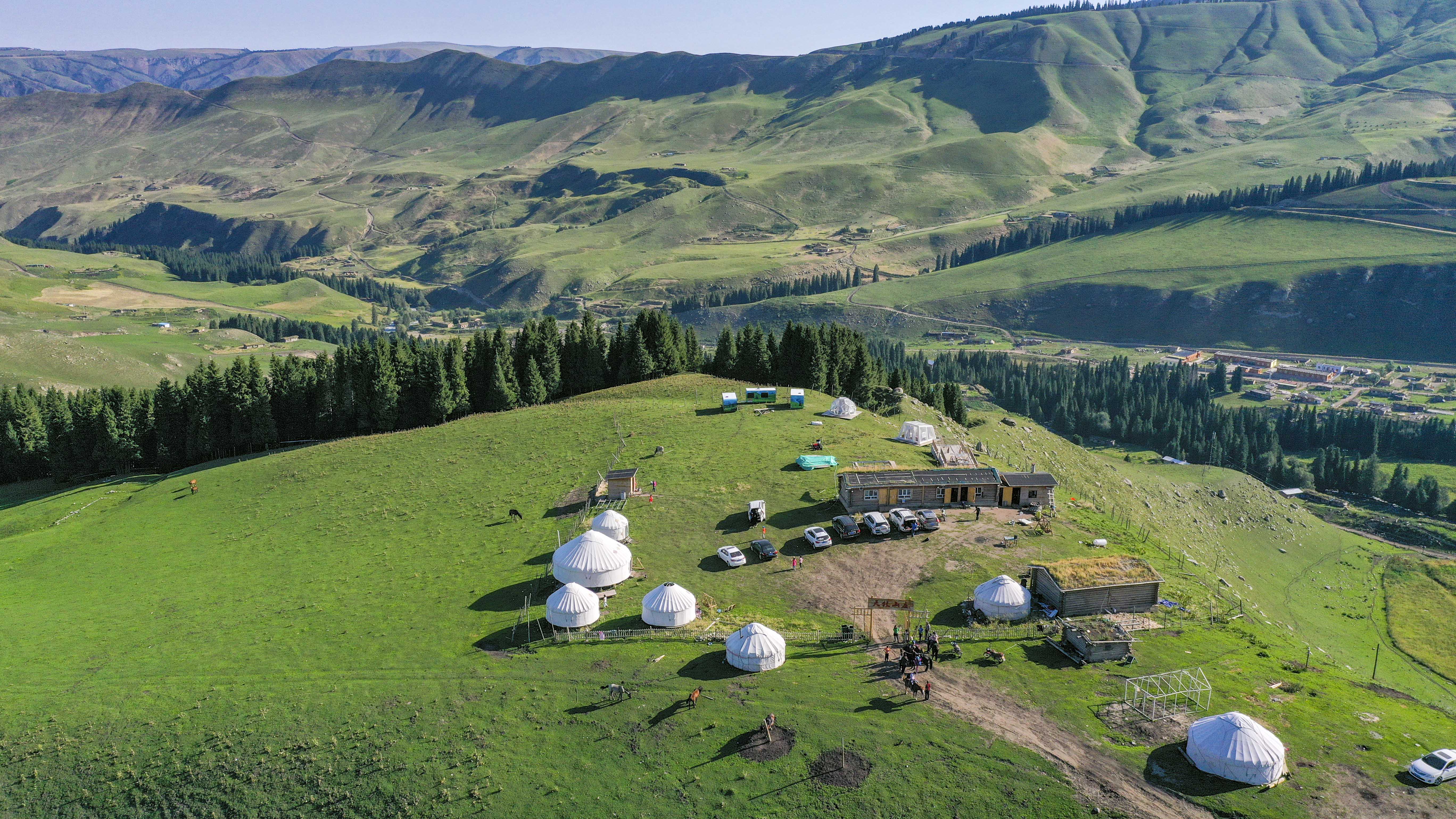 新疆特克斯县喀拉达拉镇琼库什台村的一处“牧家乐”(无人机照片,2019年8月13日摄)。新华社记者胡虎虎摄