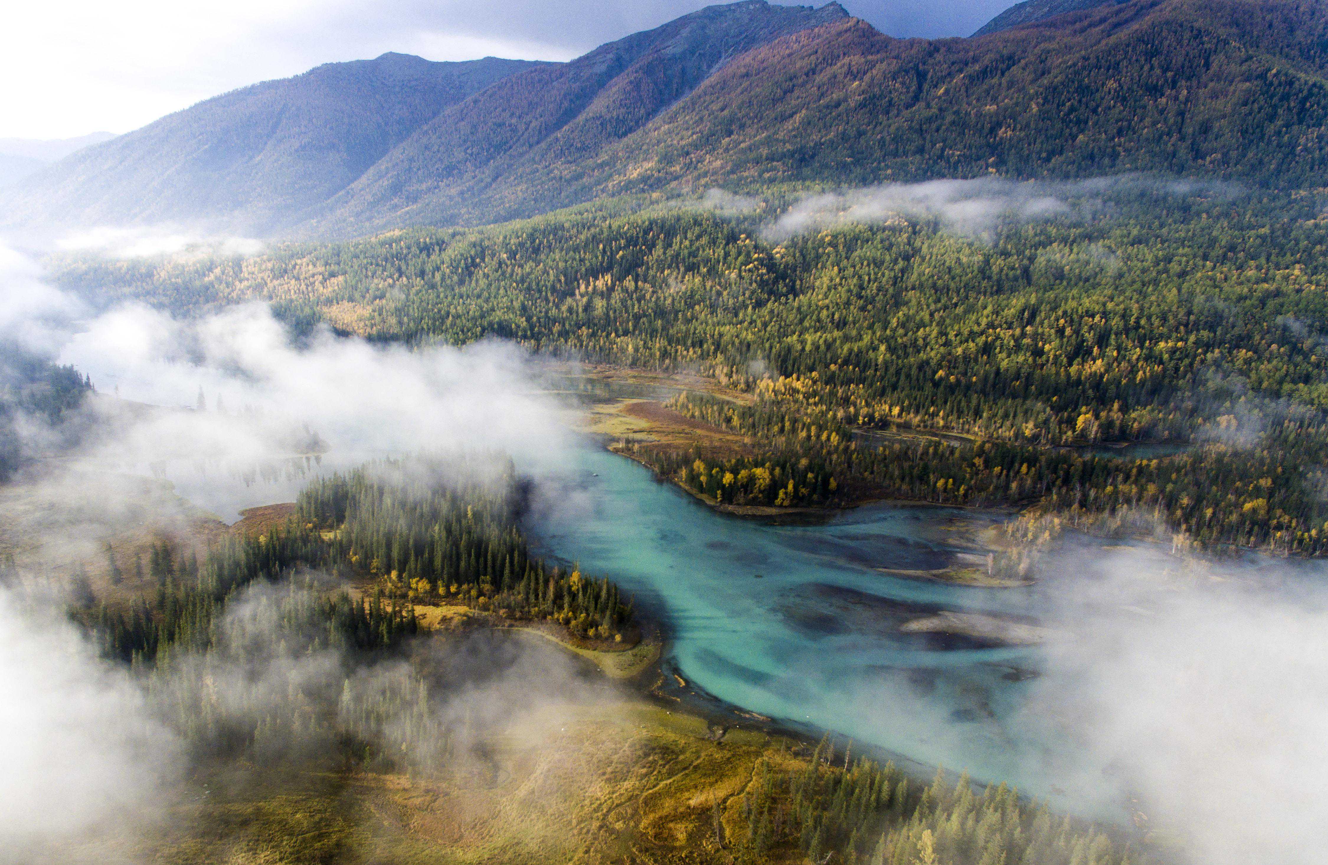 新疆阿勒泰喀纳斯景区风光(无人机照片,2019年9月24日摄)。新华社记者王菲摄