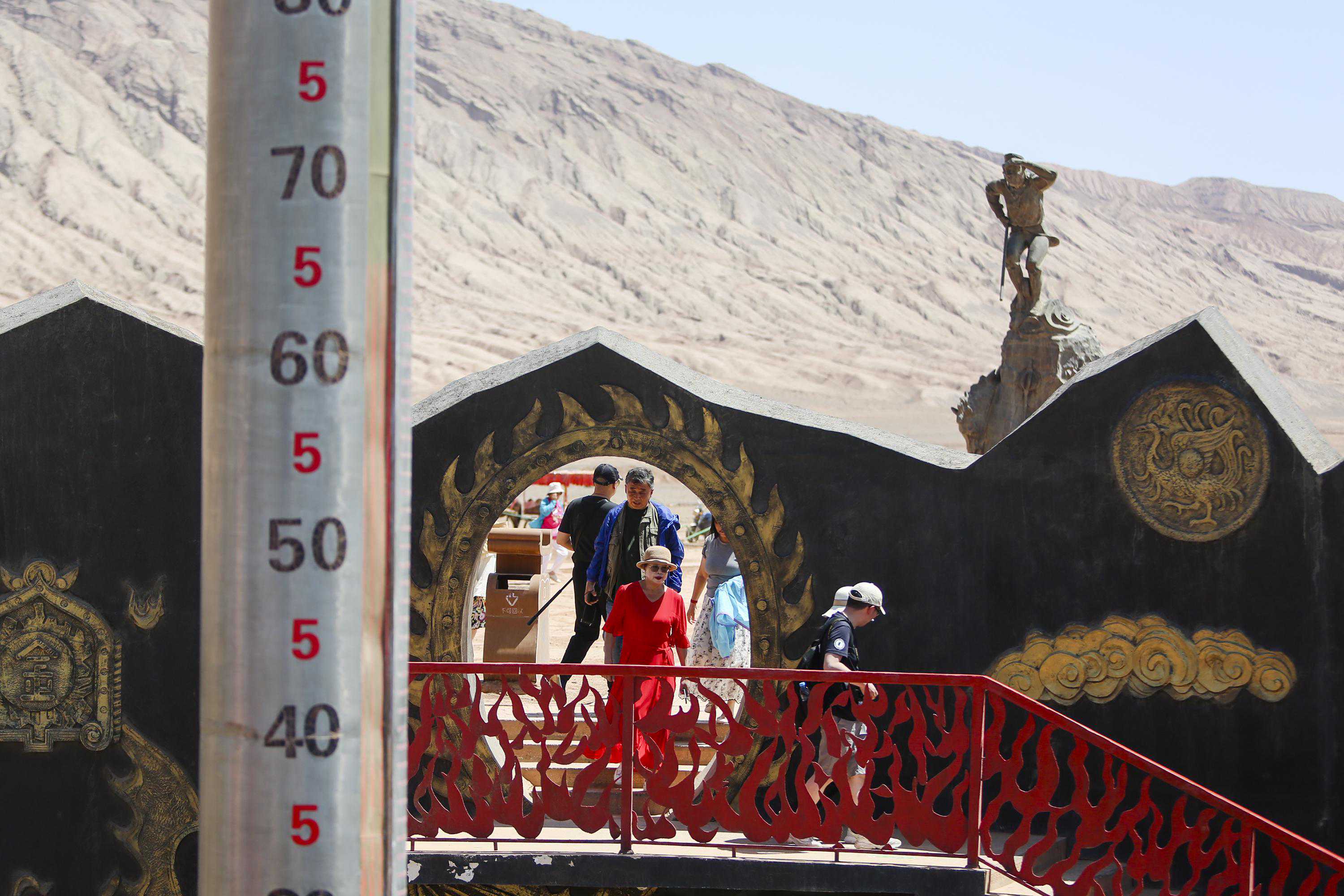 游客在位于新疆吐鲁番的火焰山景区游玩(2023年6月27日摄)。新华社记者郝昭摄