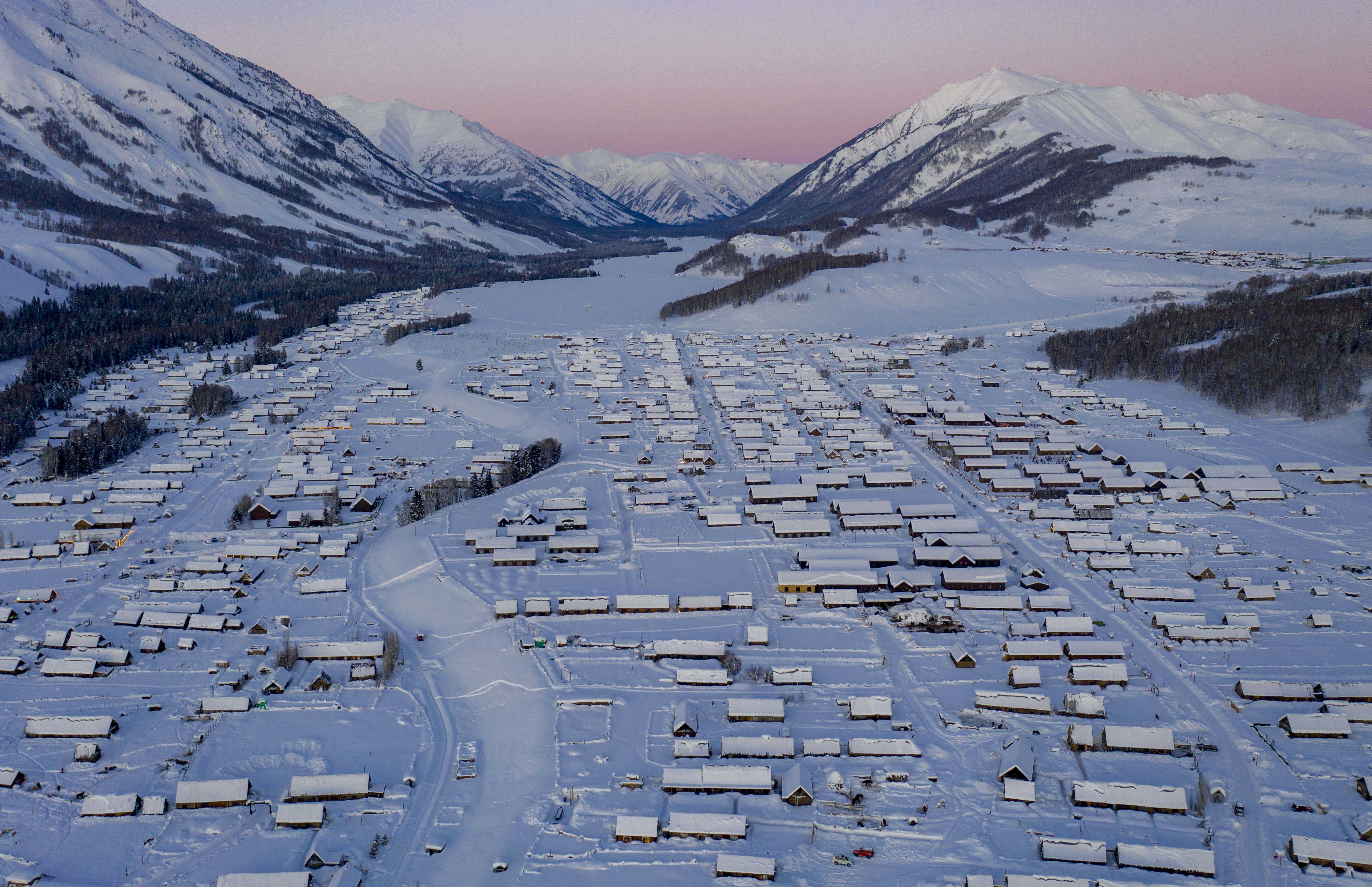 可可托海景区银装素裹,景色迷人(无人机照片,2020年12月29日摄)。新华社记者沙达提摄