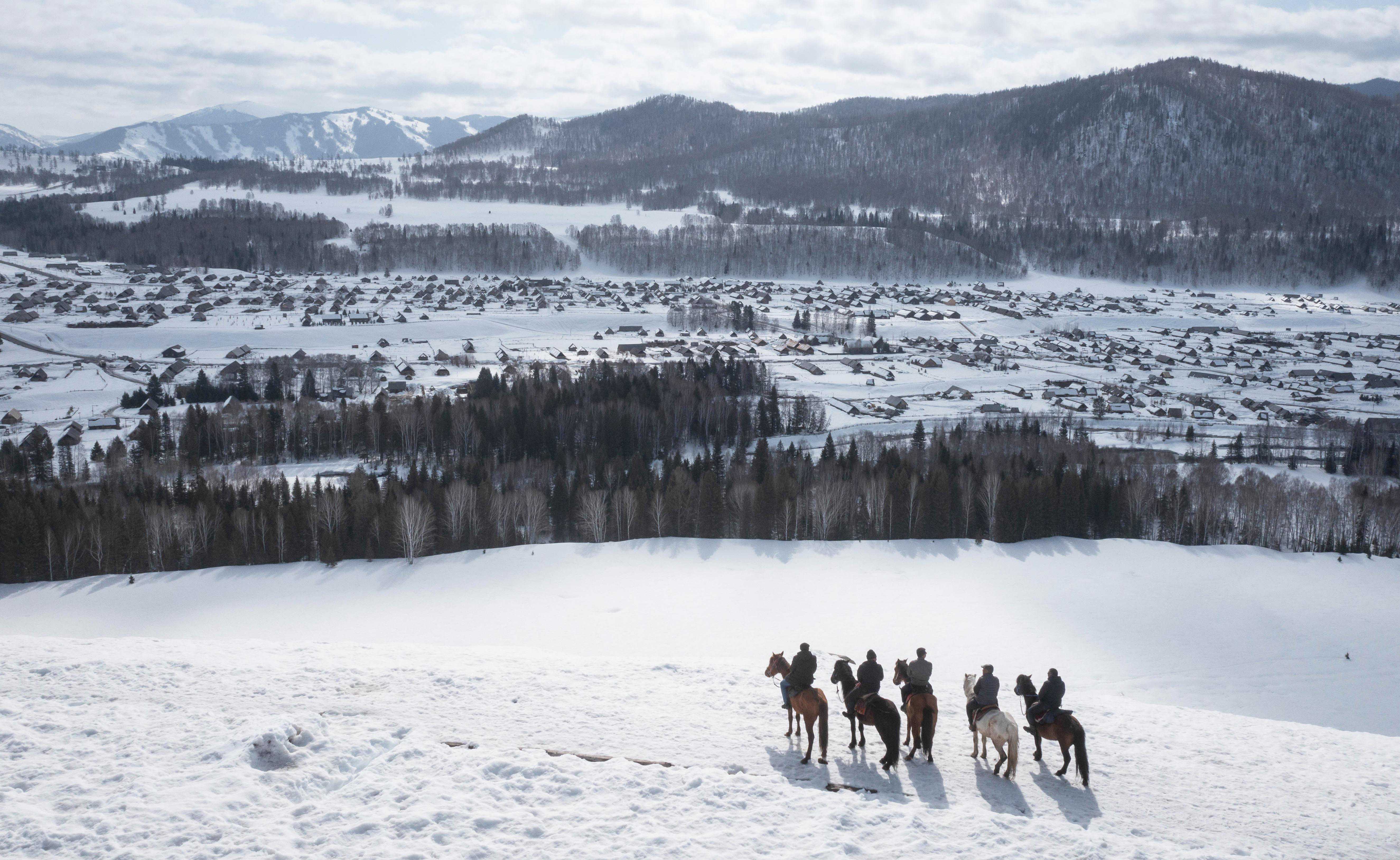 新疆阿勒泰地区禾木村观光马队农民专业合作社队员骑马走在禾木村后山的观景平台上(无人机照片,2023年3月30日摄)。新华社记者李响摄