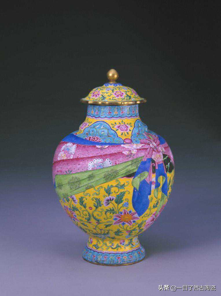 清乾隆铜胎画珐琅袱系纹盖罐