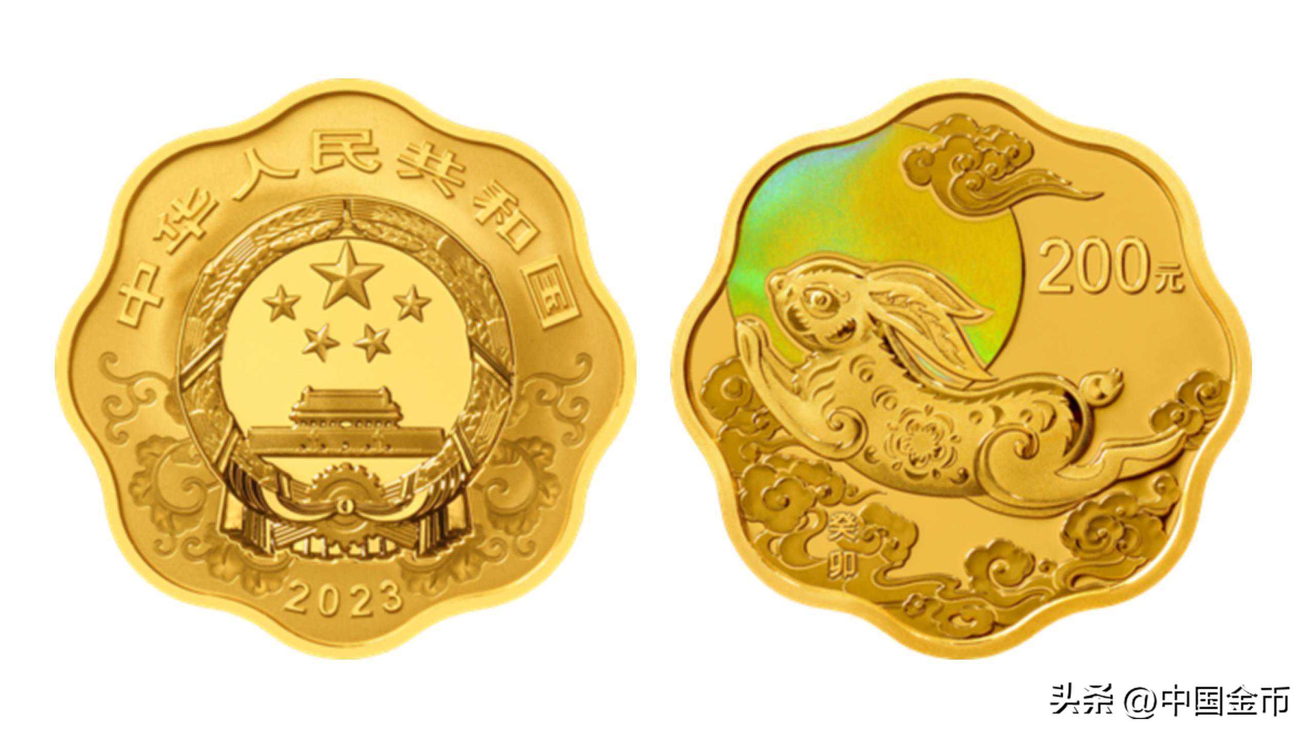 1公斤梅花形金质纪念币背面图案为装饰兔造型,衬以装饰纹样。这枚金币是最能体现兔子如精灵般轻灵生动的形象,兔子长长的耳朵呈管状长在头后侧,前肢虽短,却奋力往前跳,可看出其腿肌发达。光变鳞彩工艺效果的弧线给人一种平静感,在这外接圆直径10厘米的币面上,实现了动与静、明与暗的和谐统一。
