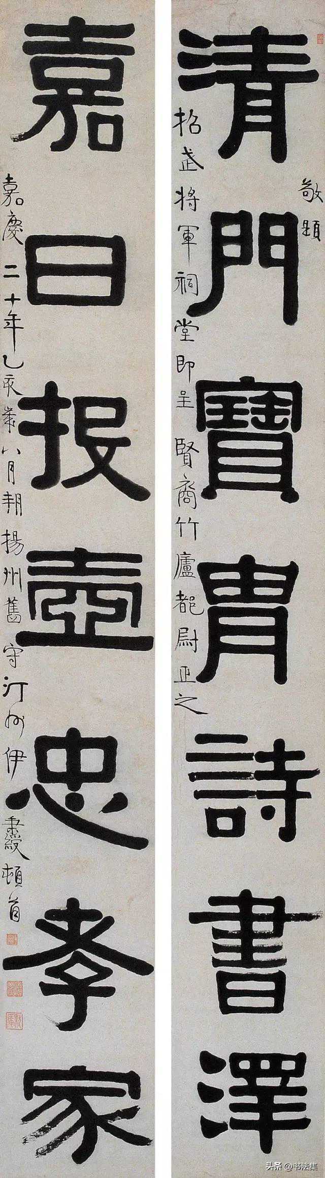 伊秉绶的隶书左右开合,气势博大,具有较强的装饰性,但写的不好,有美术字之讥。一般伊秉绶的隶书用笔较圆劲,有篆籀意味,而这件隶书用方笔较多,倒有点像金农的书法用笔,或受其影响也未可知,这件作品写的平实,和文字笔画少有关。这种联写好不易,因缺少对比,难以变化之故。