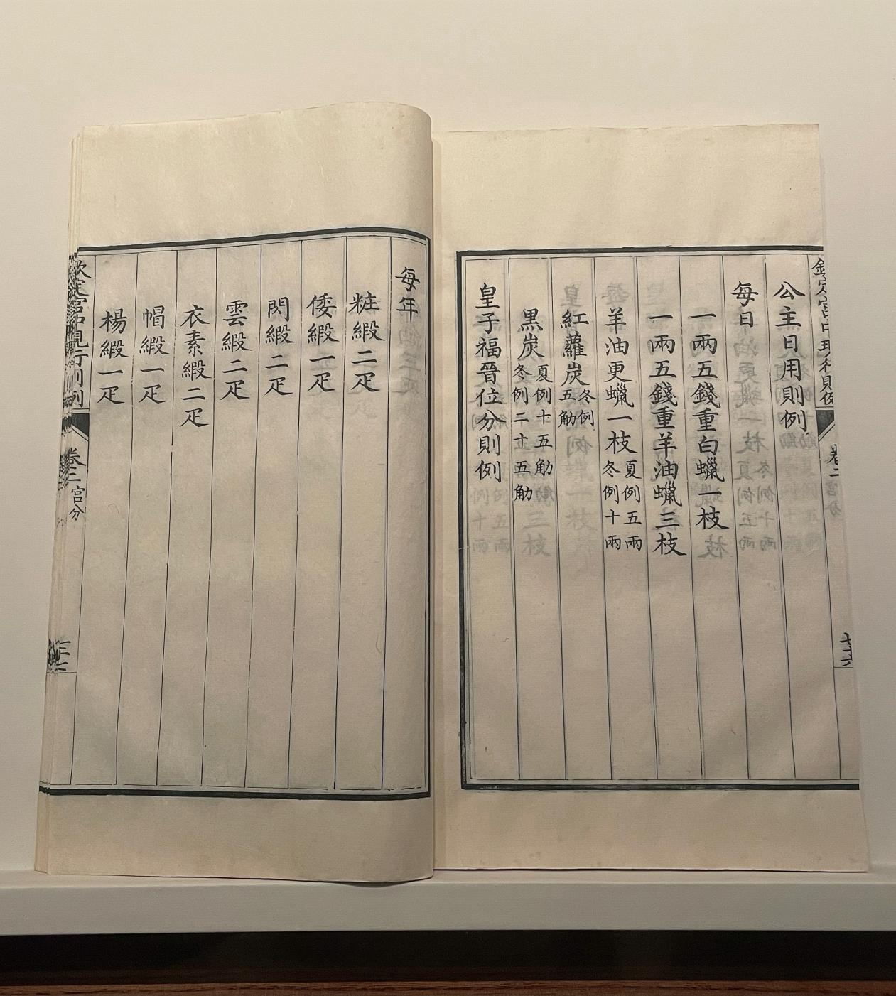 王朝更迭,机构可以继续沿用,但配套法律、管理制度均需再次商榷。《钦定宗人府则例》雕版和《钦定宫中现行则例》雕版正是清朝制定的一种规范性法律文件底版。“则例”是中国古代法律的称谓,有准则、定例之意。在清代,《则例》是中央各行政部门为行使具体职权而编修的办事章程,列出了该部门负责办理各项事宜的规则、流程、案例、条款等。《则例》使用雕版印刷可以极大保证字体、内容甚至是装潢都保持整齐划一的形制,在具有高度规范性的文件管理下,避免失范。