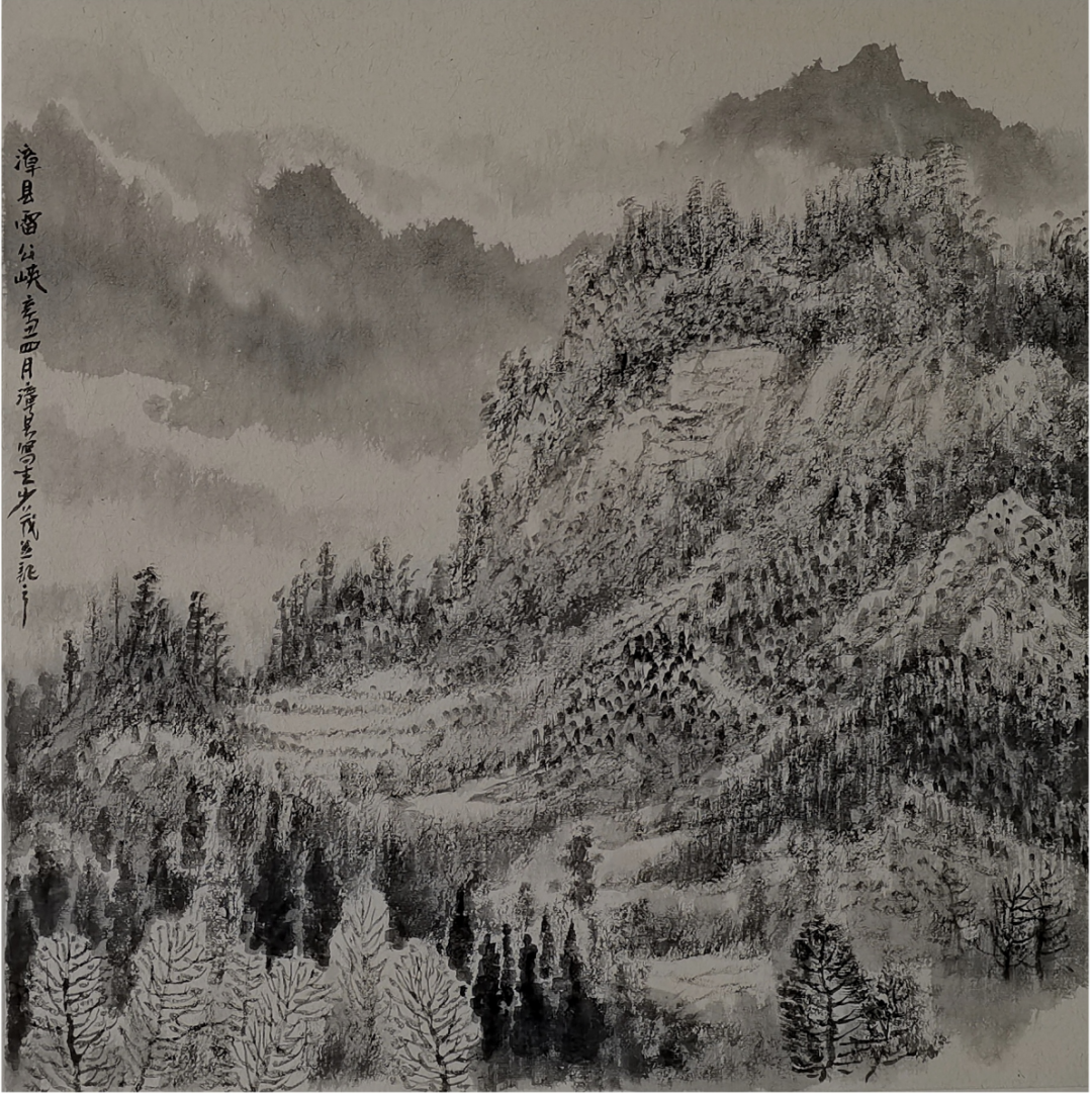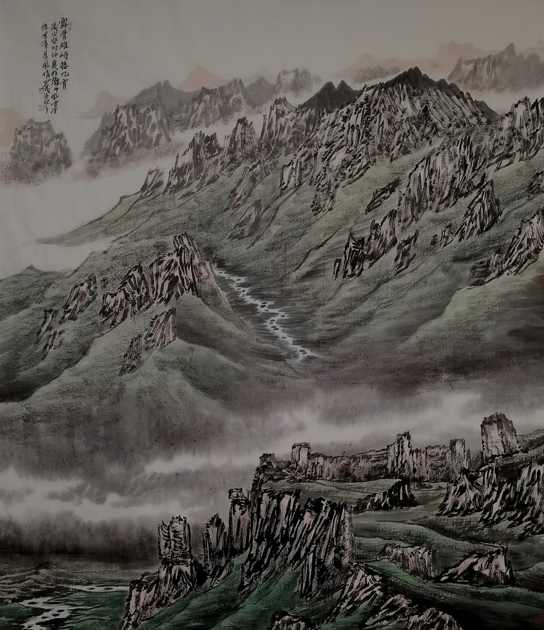 一般而言,观念的不同,导致笔法与山水结体之间产生变异。但包少茂的山水实践,并非观念先行,他一开始就摆脱了前辈画家背负的以历史为主体的人文精神,从笔墨语言的尝试和探索中,提炼出符合自己生命底色的山水信仰:包少茂从小生活在著名的当归之乡——岷县的大山深处,在那里,岷山尽管驰名天下,高不可攀,却长期笼罩在贫寒之中,一种巨大的力量在这种反差中产生。当他走出大山之后,这种感受和经验就更加突出了,“岷山”成就了他最初的绘画,又矗立在记忆和视觉的尽头,成为永远的指引——至大至刚,崇高而又圣洁。由此出发,构成了包少茂西部山水画的精神谱系。
