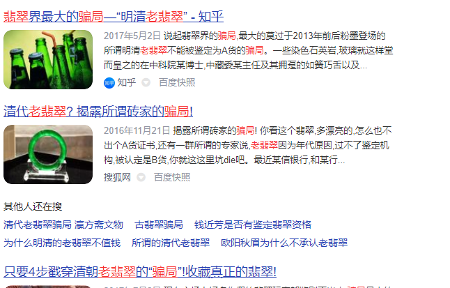 老翡翠,属于近几年才冒出来的翡翠名词,却以高频率的曝光不停地出现在我们的视线里。王春阳博士、“中科院广州地化所”、唐和唐号称老翡翠三大关键词,不过现在不行了,一查这三个关键词,就会出现“骗子”“骗局”等信息,说明消费者防骗意识提高了,不再被这些洗脑式的商业论调所欺骗了。