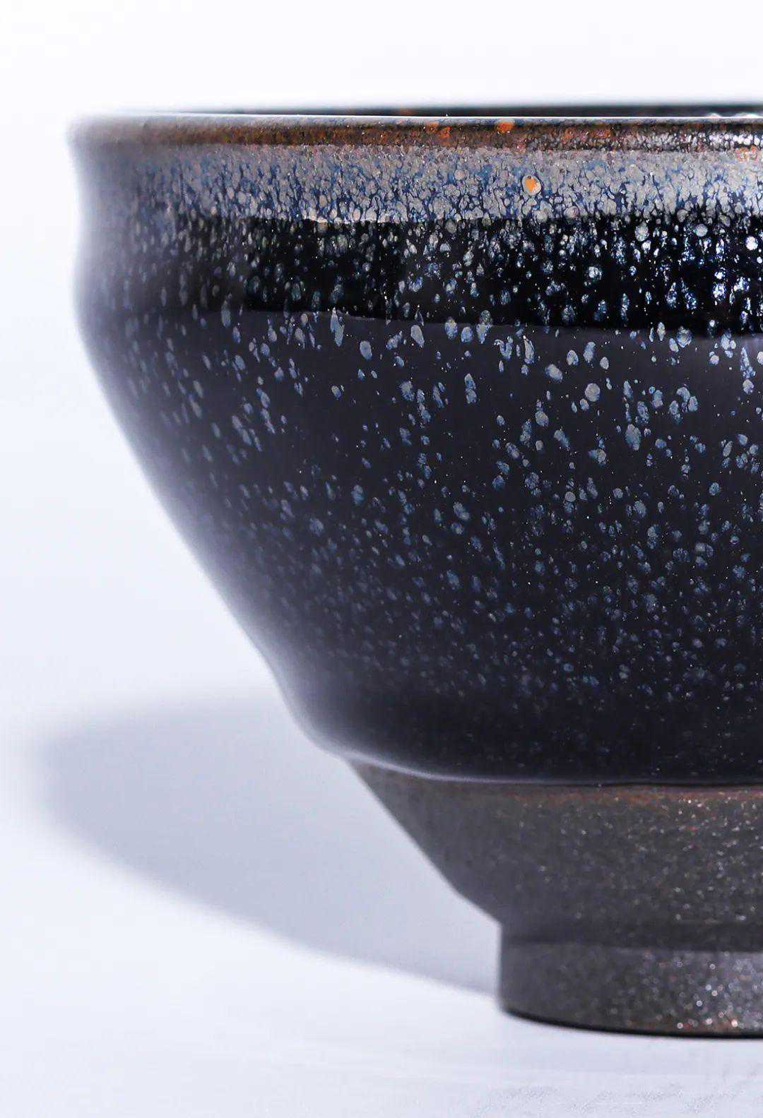 伴着一束光随之去转动盏身,漫漫绀黑中反射出幽幽蓝光,是一缕神秘莫测,是一种魂牵梦萦,是一探究竟。超强的镜面与金属感最是夺人眼球,似是文章精彩的序一般让人忍不住想往下看。而蓝油滴斑纹的表现更是不遑多让。