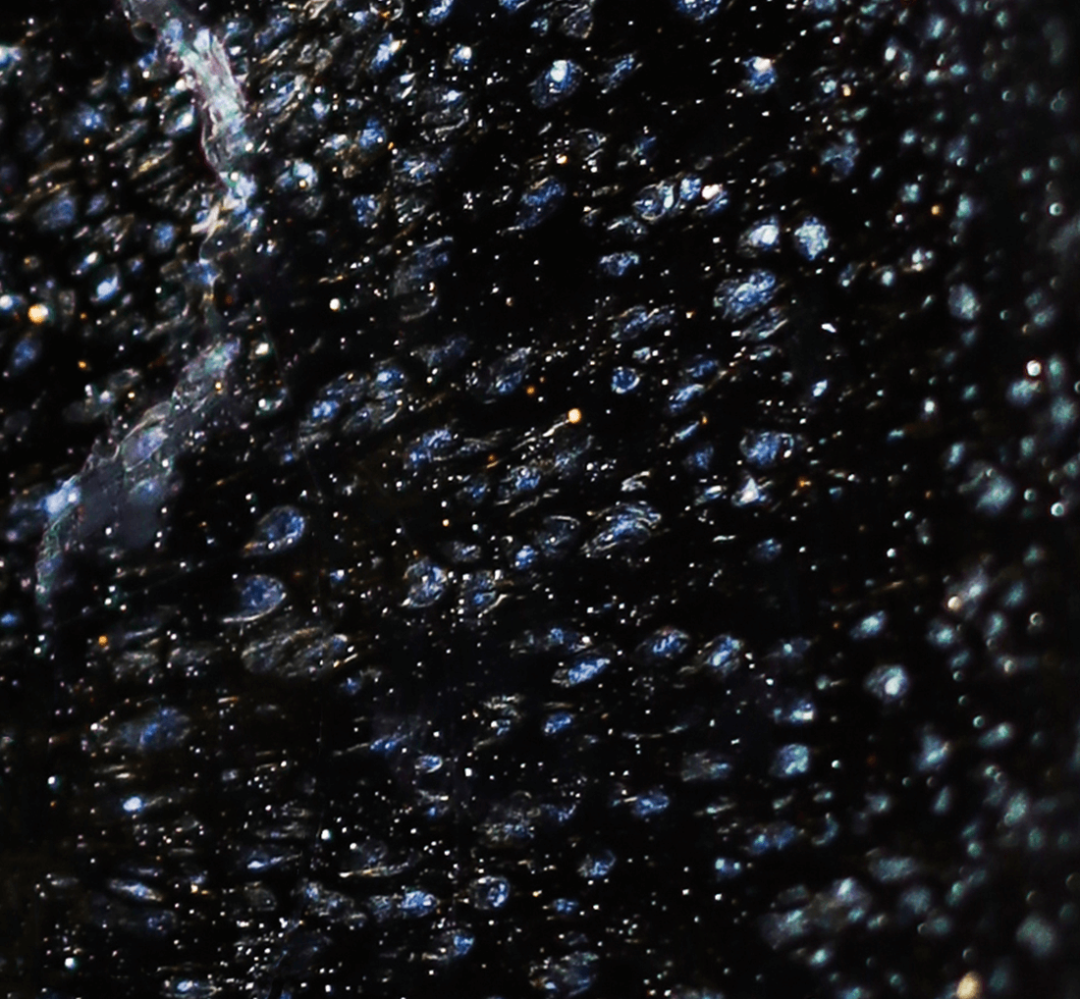 绀黑的盏身内外遍布三五成群的蓝油滴,析出的晶体十分纯粹没有杂质,蓝油滴呈现的斑点圆润且大小均匀。斑与斑之间边界分明,形态灵动。