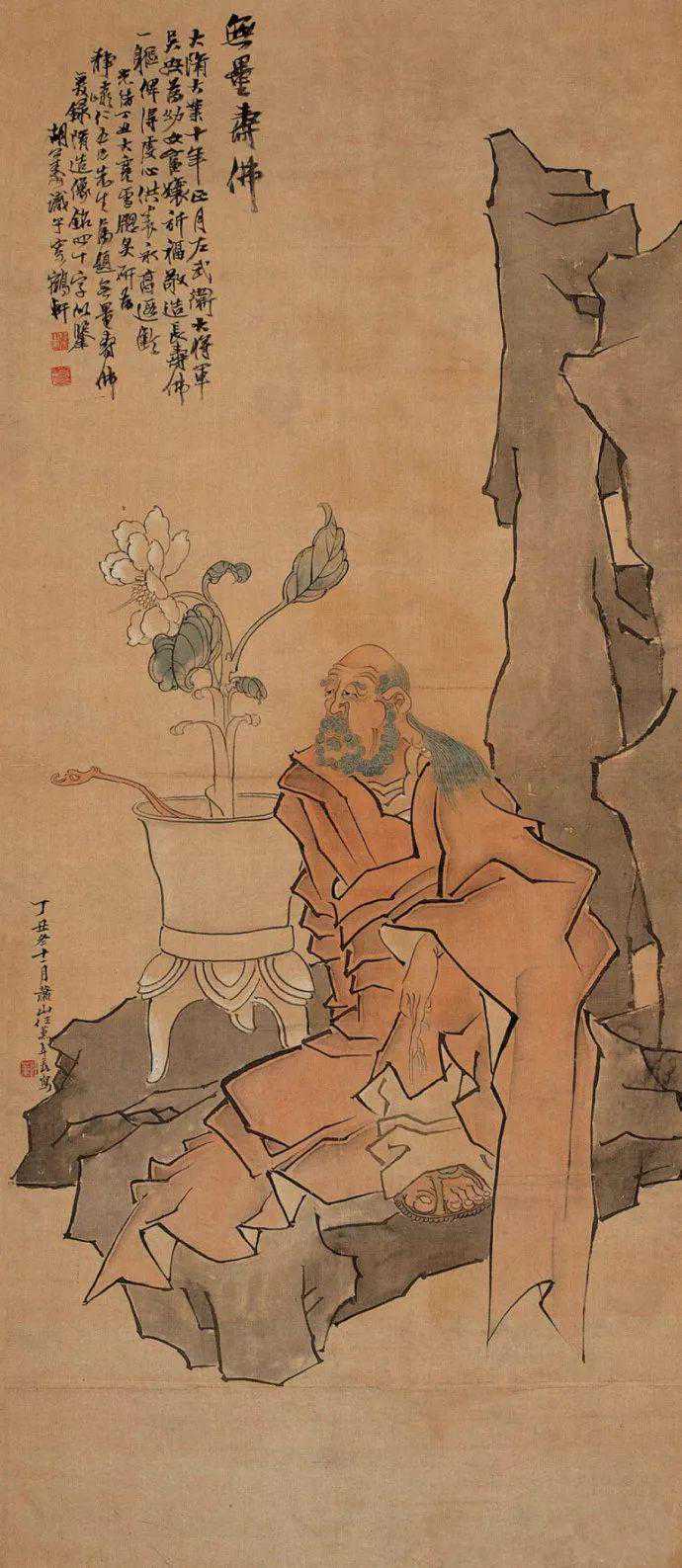 任熊在杭州得到同乡陆冶山相助,结识了许多画友。此时他的肖像画已为人所重,然他对传统艺术的学习仍孜孜不倦,临摹了杭州孤山圣因寺贯休的十六罗汉石刻画像。