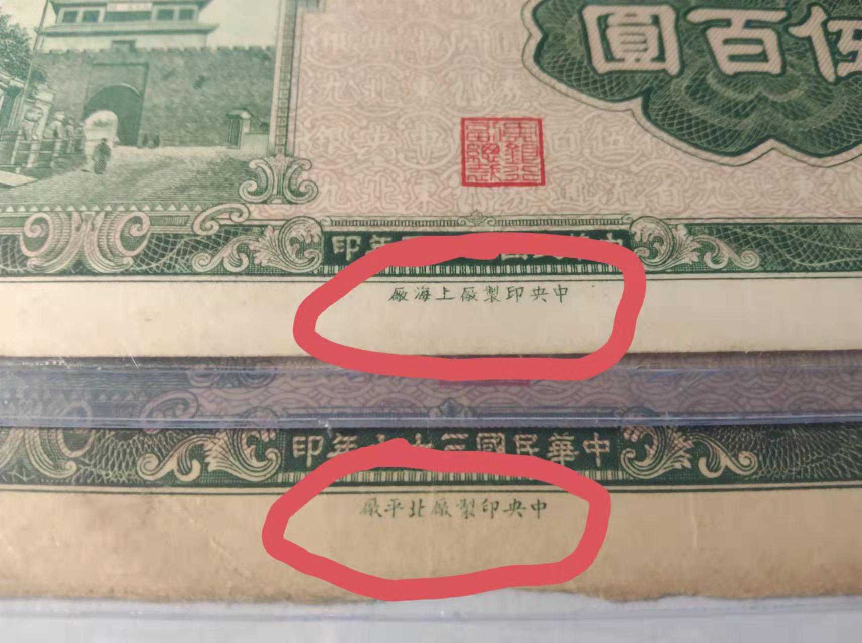 也就是说,“东北九省流通券”中的绿500元有二种,纸币非常雷同,但是分为上海版和北平版,如果你在这类纸币中发现了北平版,那你就是“捡漏”了。