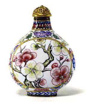 画珐琅梅花图鼻烟壶,典型的西方技法结合中国传统的赏梅文化。康熙年间宫廷御制的画珐琅鼻烟壶存世极少,故宫仅收藏两件,此为其一,弥足珍贵。