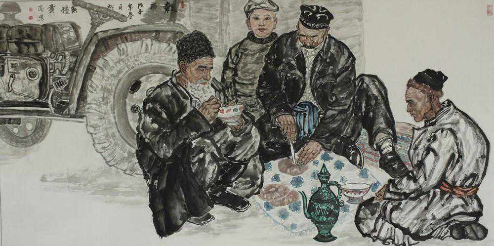 马寿民是一个厚道、少言寡语的西北汉子。只知道做人、做事、做画.“画如其人”。他把中国传统中诸多表现形式的要素创造性地结合.来表现他的构思。从他近来创作的新疆人物组画中,可以发现其”语言形式”发挥了水墨特有的表现形式。马寿民一方面继承了中国传统画的精髓,而又摆脱传统的羁绊.另一方面吸取西方绘画诸多元素.融会创新.丰富他生动新鲜的气韵。