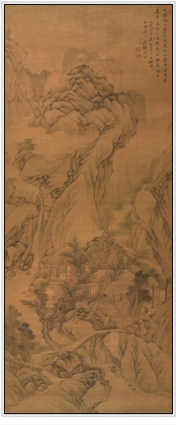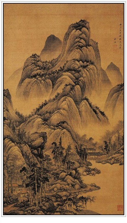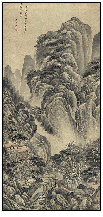 此图原名《仿黄子久山水图》。绘山峦起伏,林木丛生,山林深处村屋坐落,一股清泉直下。近处溪流清澈,水榭石堤,意境幽深。用笔秀丽,皴染精到,滋润浑厚,气韵苍莽。自识“庚戌九秋仿黄子久笔意,王鑑”,钤“王鑑之印”白文、“湘碧”朱文方印(按:庚戌为康熙九年,公元一六七0年,作者时年七十三岁),为王鉴晚年佳作。构图繁而不乱,山石错落有致,而且笔法华润圆细,秀逸中不失严谨,纤细而不流于柔弱,刚柔并济,浓淡兼施,皴染同举,别有风采。