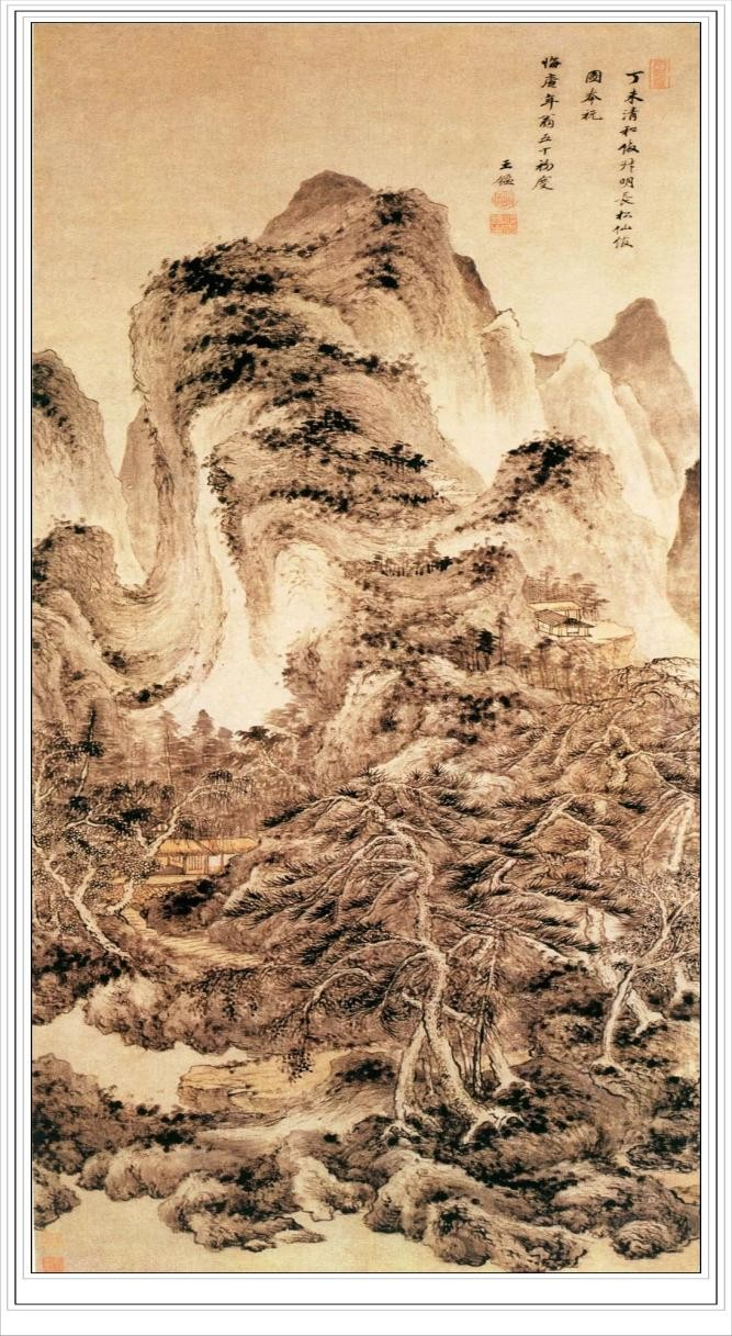 王鉴此图画层层山峦簇拥主峰,苍翠丛林之中,村舍水阁错落,山石用长披麻皴,深得巨然之韵。