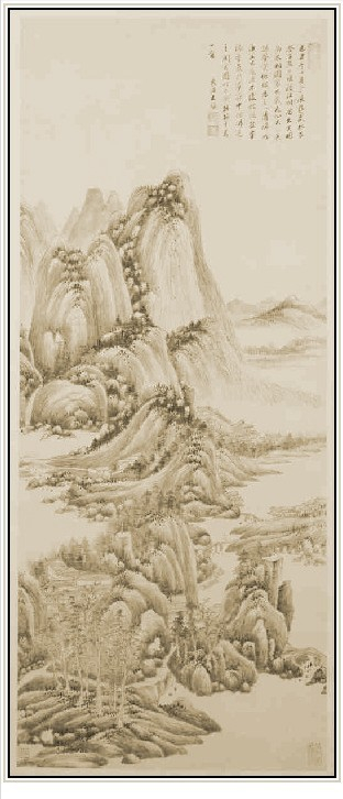 王鉴所绘直幅大轴,多仿董巨、黄公望、王蒙画法,此幅仿学吴镇(梅道人)则较为稀见。因仿吴镇画法,故笔法稍粗而不尖,且笔墨浑融,景物层次分明,为作者晚年杰作。自识[丁未小春仿梅道人溪亭山色,王鉴]。钤[染香庵主]白文方印。图中另有王翚、恽寿平二家题赏,更为该作增色。按丁未为康熙六年,公元一六六七年,作者时年七十岁。