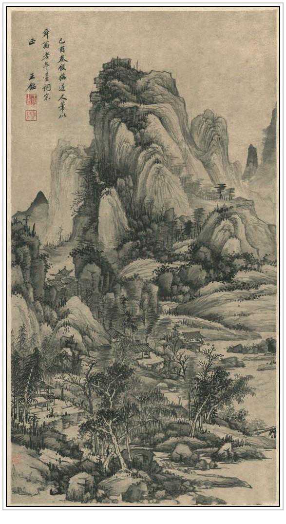此画为竖构图,布局疏密有致,构图繁而不塞,景物杂而不乱,可谓层次分明、经营有序。全图以水墨画成,用浅赭色染树干、坡脚及屋墙,树木、崖顶的平台等加以石绿晕染而成。由于山石以淡墨多次皴擦渍染,又略用焦墨积加反复画成,因此画面显得浑厚壮观。然而此画用笔却含蓄内敛,丝毫没有外露的锋芒,下笔用中锋尖笔,皴法细密,准确精纯,墨色浓润,所以又显得爽洁而灵秀,再加之少量的赭色晕染,为这雅洁而丰富的墨色增加了亮度,从而达到了刚劲与柔美,雄浑与雅秀的平衡。此图署款:“庚戌九秋,访黄子久笔意,王鉴。”下钤“王鉴之印”。