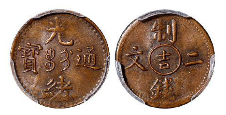 上面这枚钱币是我们吉林省造的光绪元宝二文,钱币正面中间是满文,外面是官方徐通宝的字样,这种钱币在我们的收藏市场上面是比较少见的一种钱币,吉林省造的钱币在我们的钱币收藏中来说都是比较少见的,一般情况下吉林省造的钱币都是比较珍稀的版本,钱币背面中间是一个“吉”上下是“钱制”的字样,左右是二文的字样。对于这枚钱币来说我们很多人是没有见过,如果遇到的话是可以收藏的。