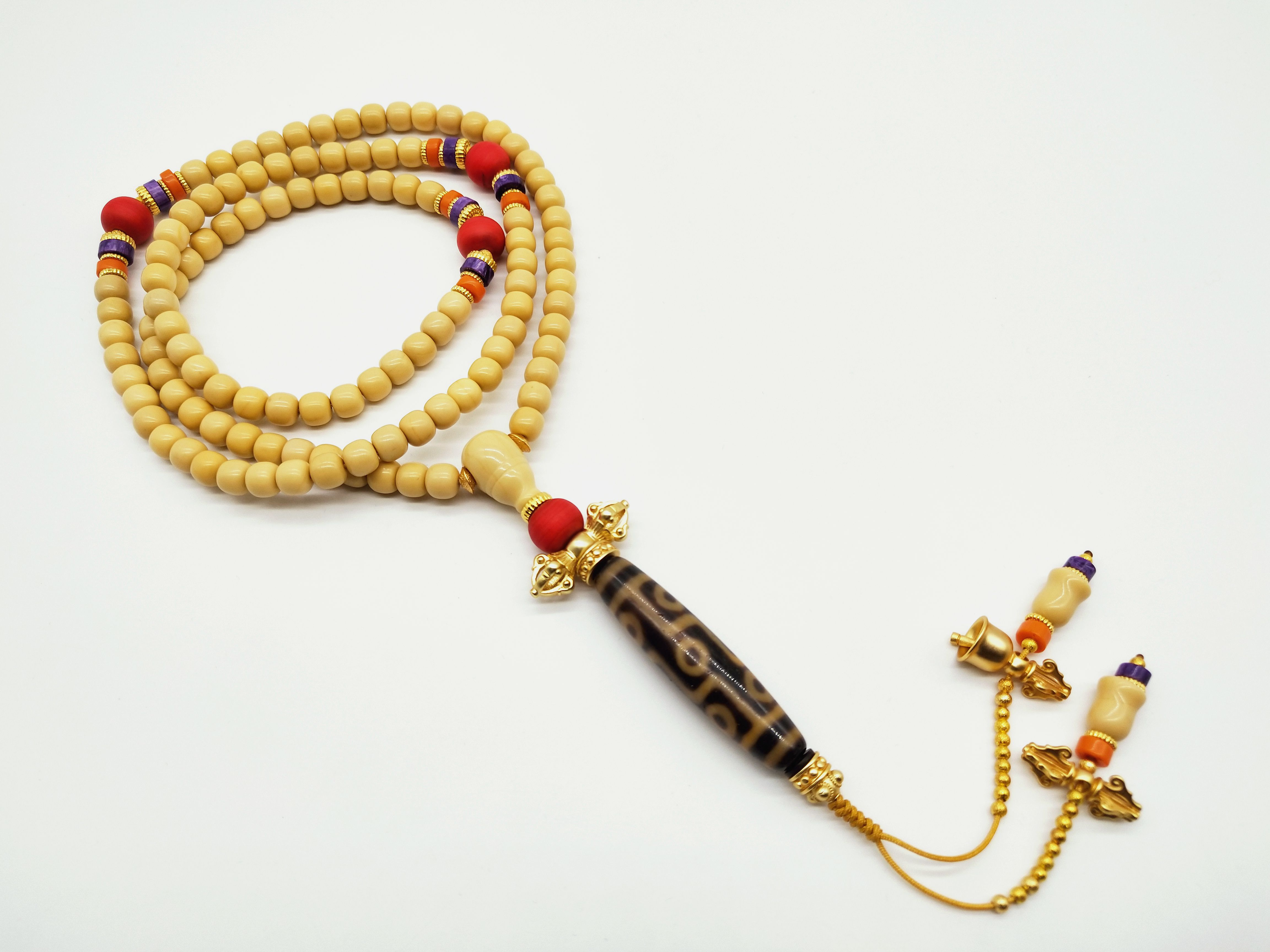 1、念珠:念经、念咒、念佛号应用的佛珠,佛珠能帮助修行、消除妄念,待日久功深,增加智慧,获得无量的功德。念珠种类可按息、增、怀、诛四大事业区分,佛珠的材料和用法及作用都不一样。