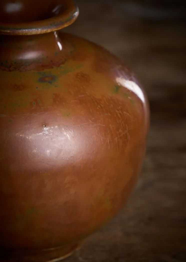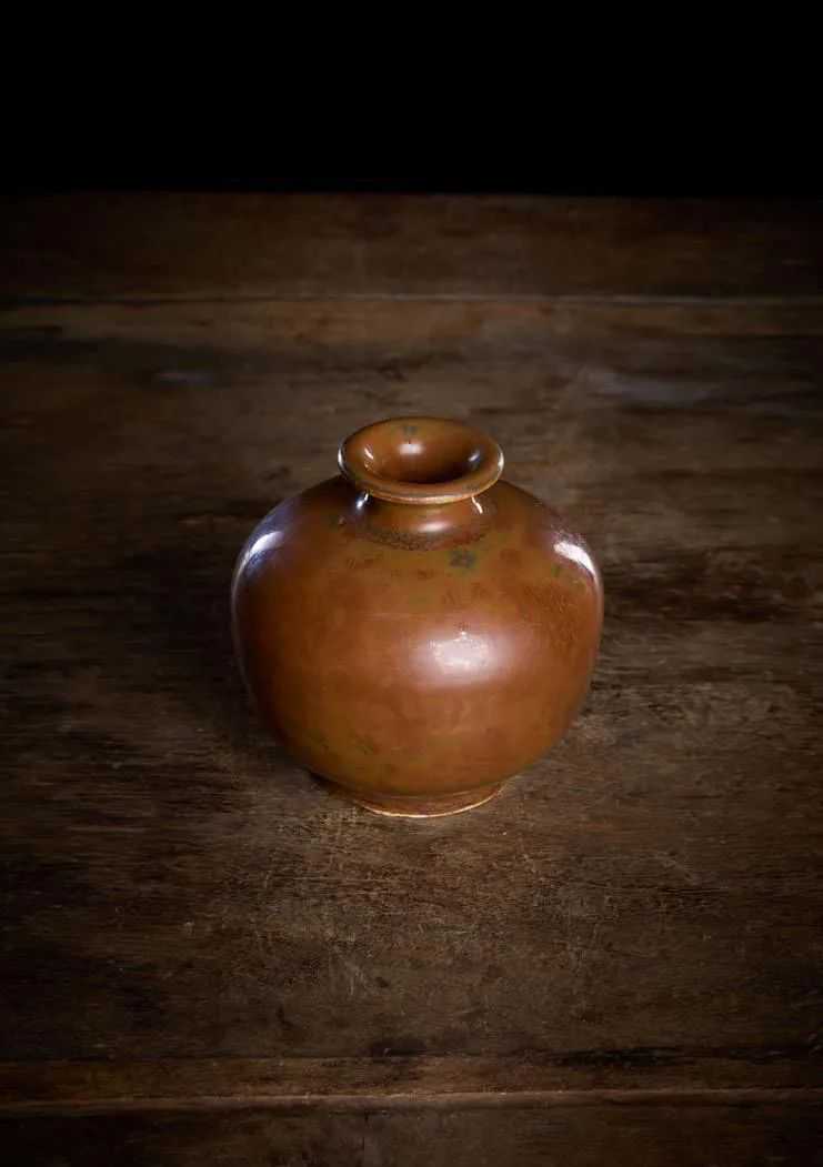 定窑少有的精品酱釉,即“紫定”,色泽滋润柔和,呈色稳定,莹洁可鉴,在烧窑中有些许窑变出现,在酱釉之上有近乎铁色的窑变色斑出现,让单色釉中仍有色彩的跳跃变化,在视觉中有过渡和灵动之享,釉色营造的内敛和高级感,让整器更具宋瓷的典雅含蓄,传承了宋代文化的精髓——质朴且典雅。