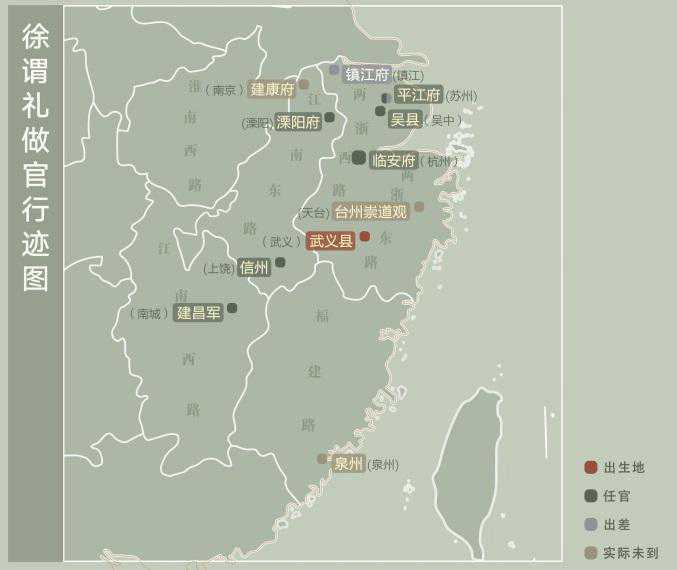 徐谓礼(1202-1254),字敬之,婺州武义人,是南宋权臣徐邦宪之子。徐谓礼的妻子林处端的曾祖父林大中为南宋名臣。徐谓礼在“及冠”之年,因父荫入仕,以京官起步。三十多年宦海生涯,官阶从第三十阶“承务郎”(从九品)/升迁至第十八阶的“朝散大夫”(从六品)。宝祐二年病卒于“朝散大夫、提举福建市舶兼知泉州”的待阙期间。