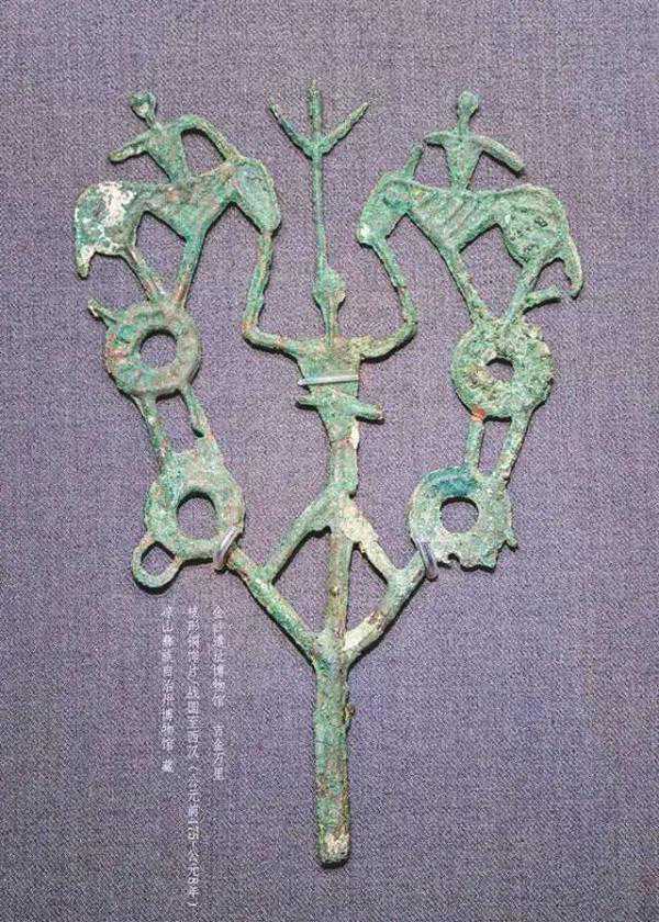 你看,那个双马人纹铜枝形器,是我们中最典型的造型。它的主体是树干,树丫正中站立一人,树干的枝端有两枚上下相连的圆壁,圆壁顶端各立一马。这个造型记录了战国至西汉时期西南居民中的一支——笮人的生活场景。