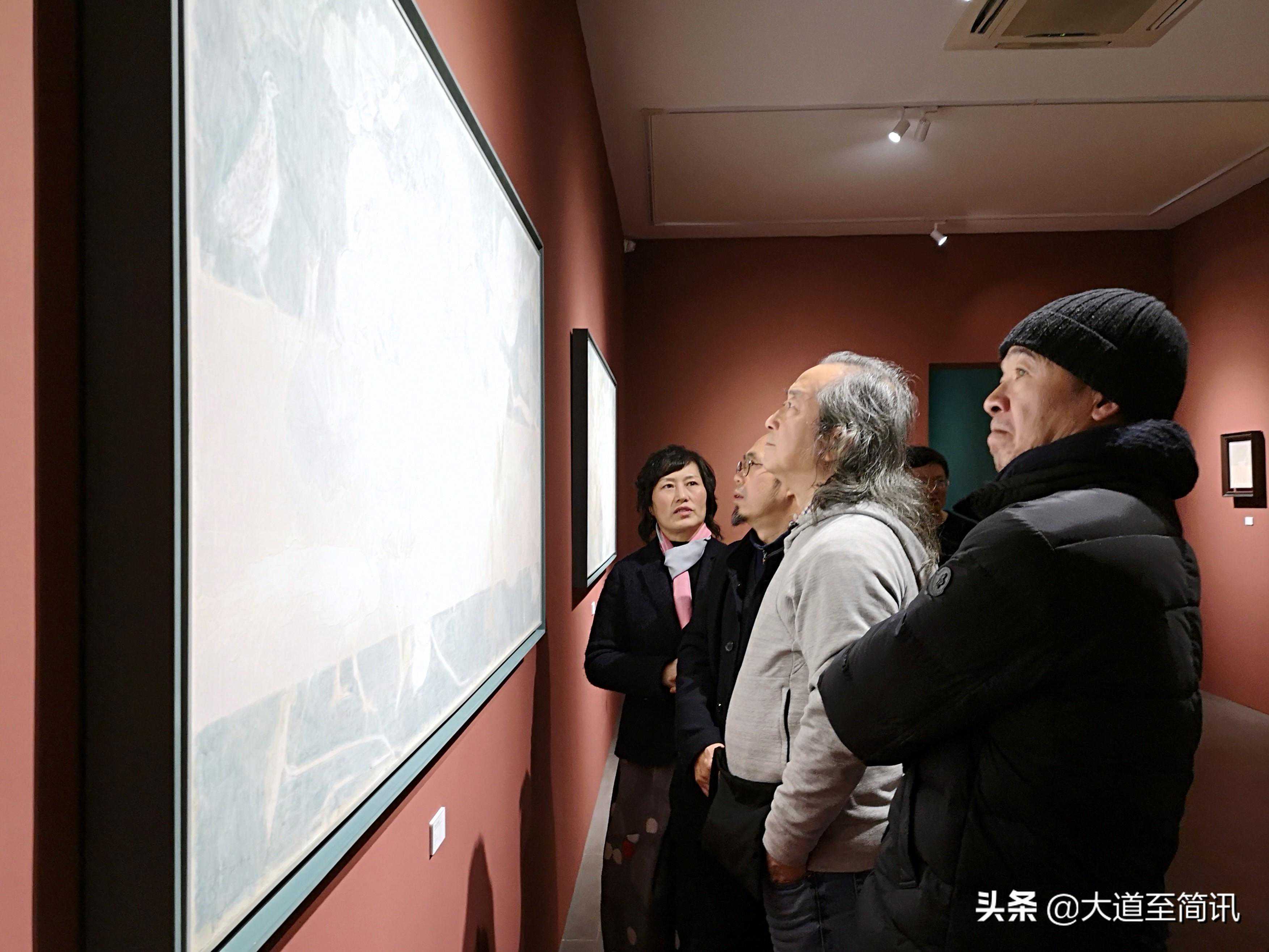 2019年12月25日,在杭州人可艺术中心,中国著名批评家吴亮(右二)、艺术家张浩(左二)等在观赏韩冬作品。当晚,致莫高窟最后一位工匠——韩冬作品展在杭州开展