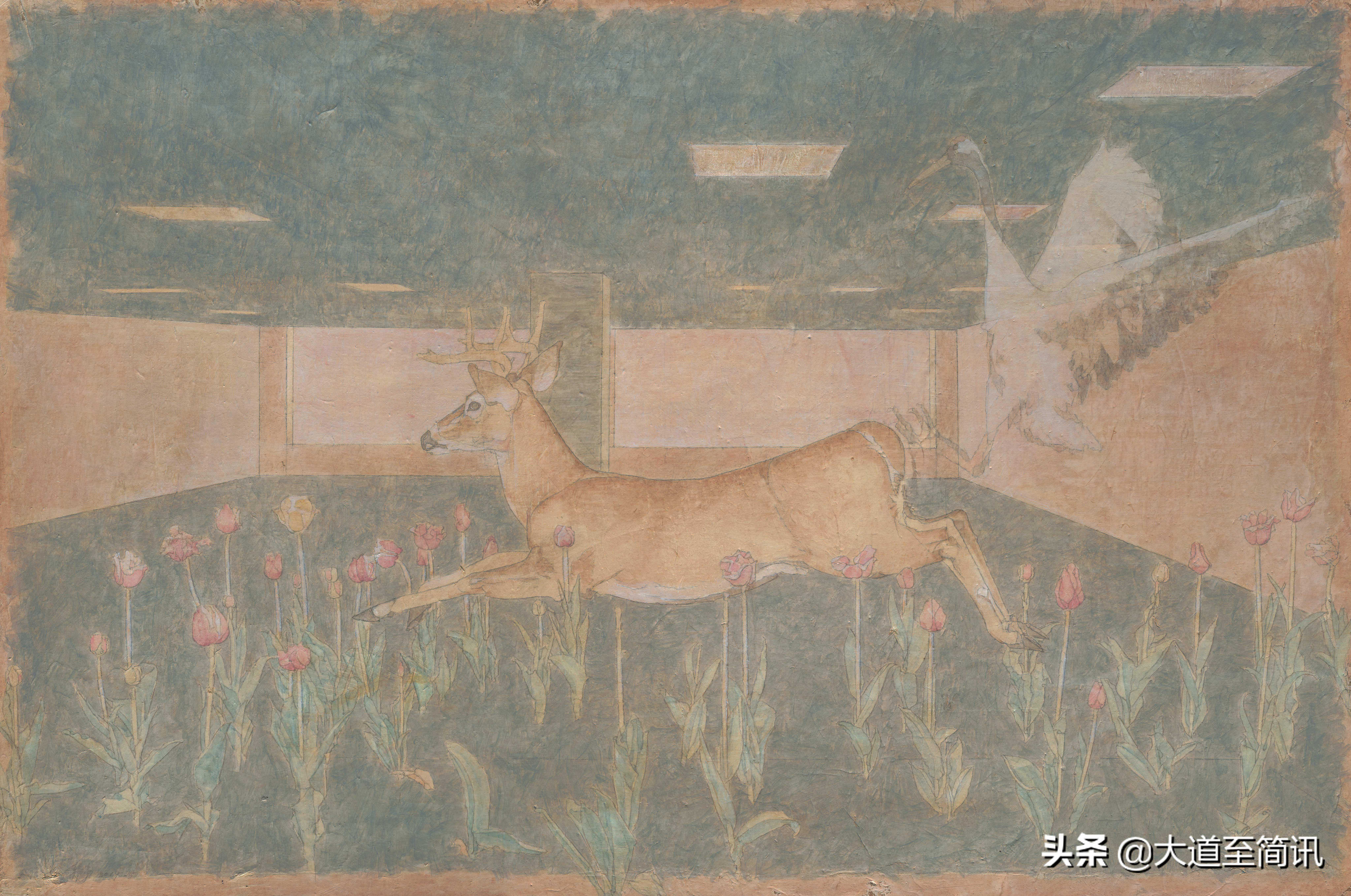 在画面中,3只羊挺拔地伫立着,凝神聆听着神明的开示;展翅的白鹤似乎守护在颇具象征意味的画框一侧。然而,高悬的画框中并未显露任何具象的神明,耐人寻味。