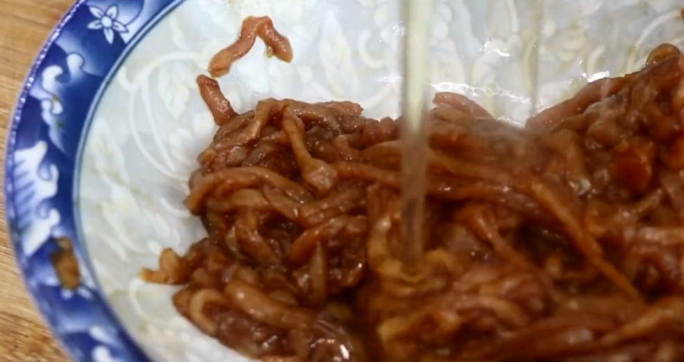 第二步:把肉丝腌制一下:加少许胡椒粉,少许老抽,适量的料酒,少许的清水,用手把它抓匀,