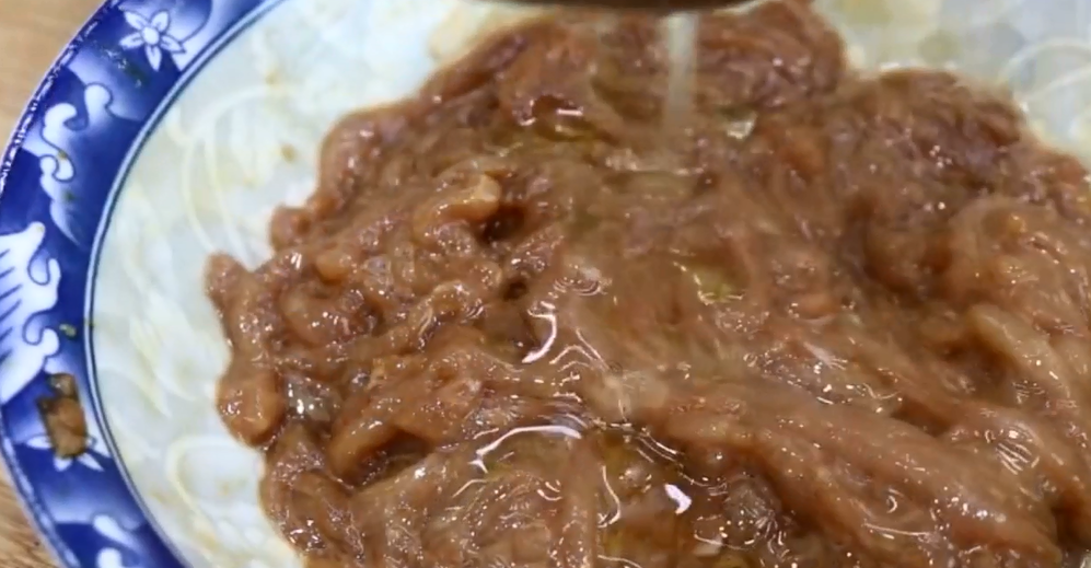 让肉把胡椒粉,老抽,料酒都吸收进去,抓匀后打入一个鸡蛋清,加鸡蛋清的目的是让肉丝更嫩滑,