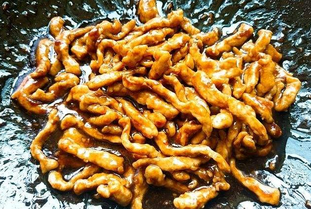 第二步:热锅烧油,油温7成热后,把锅子晃动滑一下锅,让锅壁涂满油,这样炒鱼炒肉丝就不会粘锅了,关火,让油冷却,油冷却后,把肉丝放入,快速滑散,肉丝滑熟后关火盛出备用。
