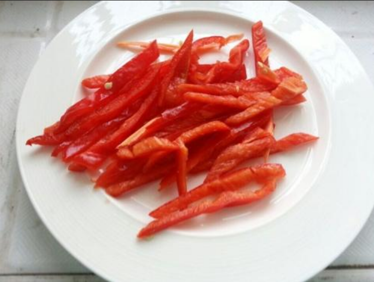 为了颜色好看,我们还可以切点红椒丝,也可以不加