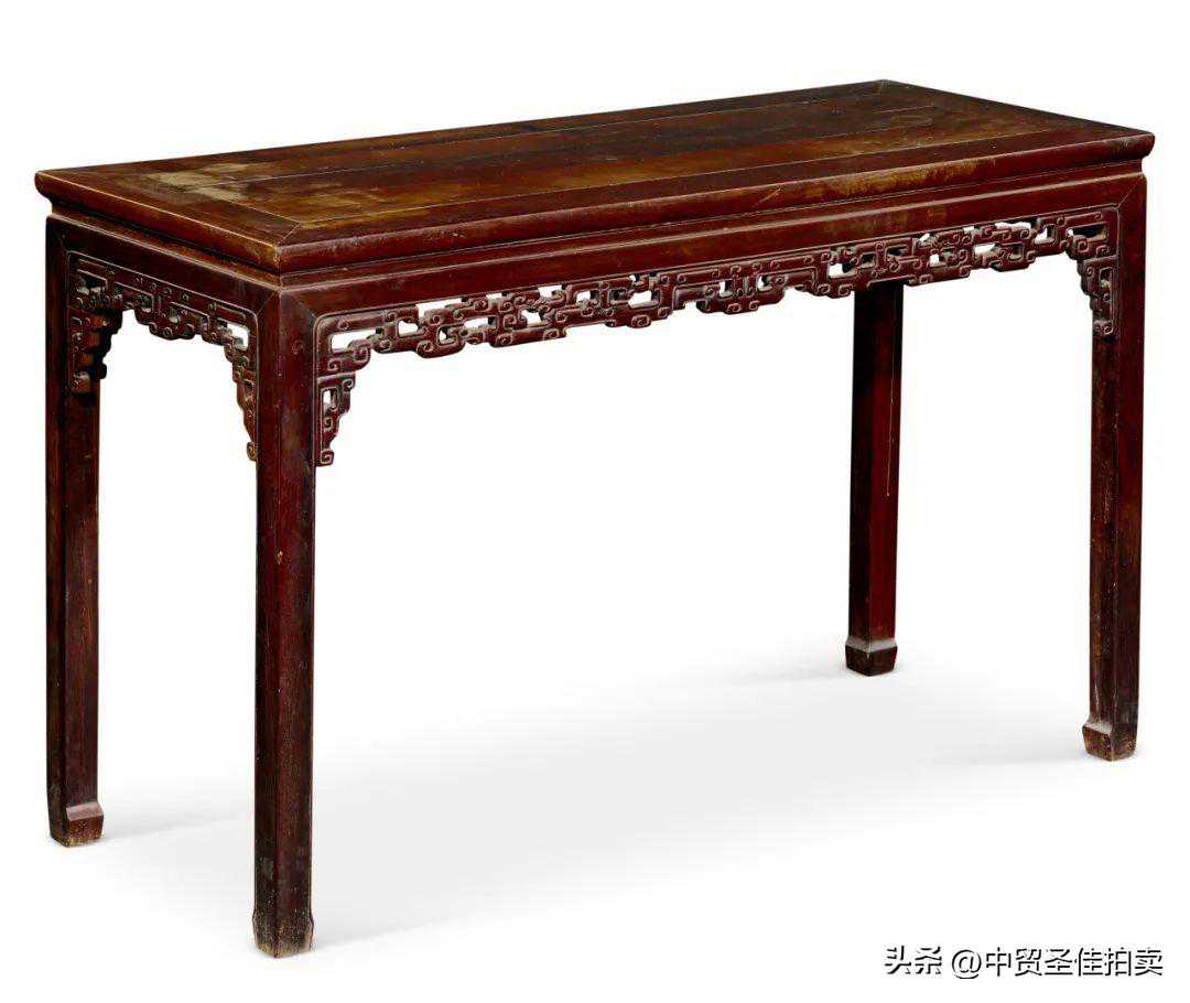 条桌以紫檀为材,造型样式为清代宫廷家具风格,桌面攒边镶三拼芯板,边抹素混面,下方压边线,并承束腰,束腰与牙板一木连做。牙板平直,边起阳线。牙条下四面另有镂雕牙板,图案布局精巧,饰有连缀的镂空螭龙纹样,整体感颇强。条桌尺寸较长,如此长度且连缀的镂雕牙板,保存完整亦殊为不易。桌下四腿直落,皆为方材,至底出内翻马蹄,亦为标准的清代条桌做法。此桌制作于清朝中期,牙板的形式、雕刻的花纹,都反映出清式家具的特征。