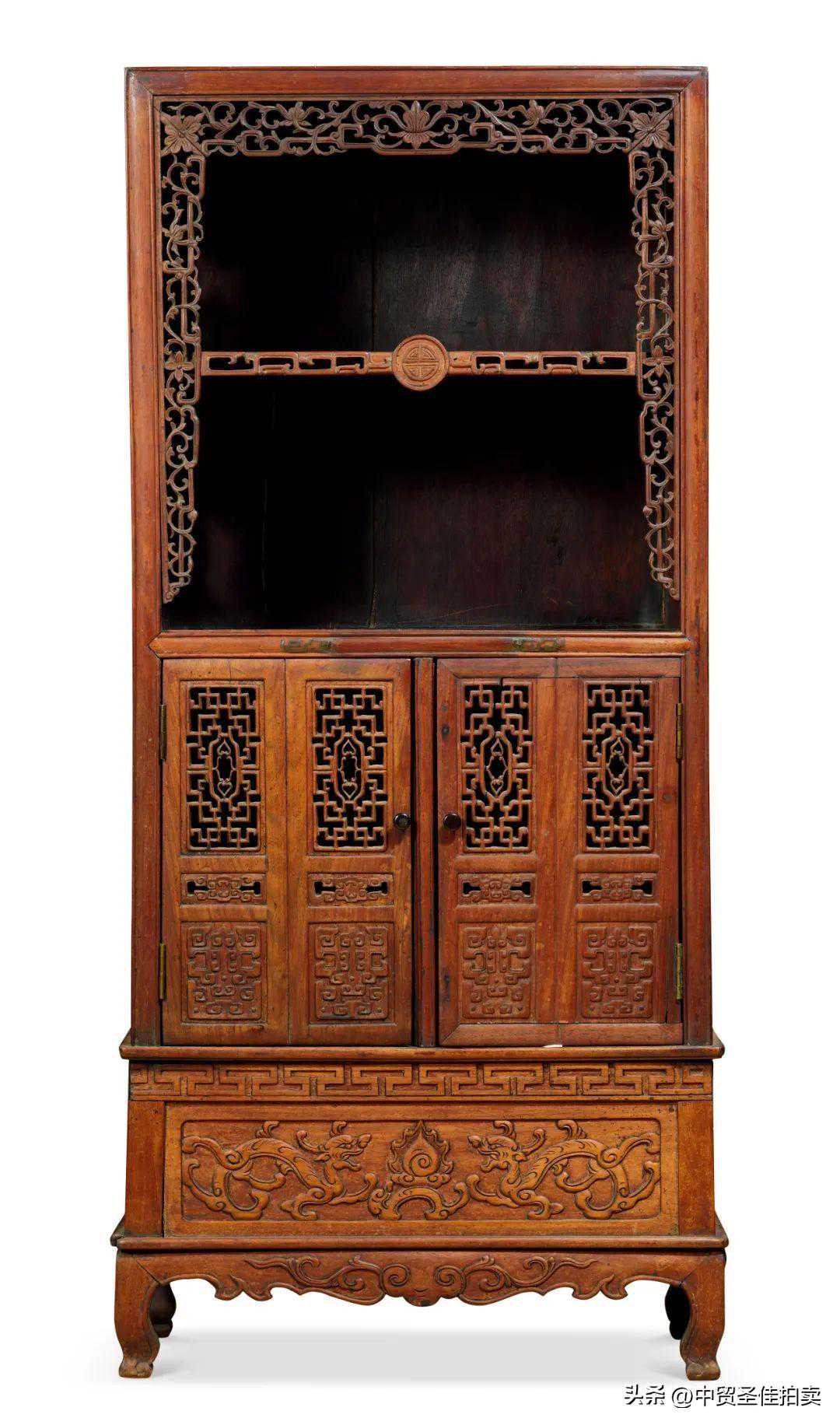 柜正面满雕升龙图,以高浮雕手法刻云龙纹。龙怒目正视,张口,须发直立上飘,五爪作车轮状伸展,勾曲有力,龙身修长,尾似鱼。云纹呈如意头状,数朵相连并托长尾。从龙及云纹的造型上看承袭乾隆“紫檀工”之技艺,牙条及正面边抹处亦浮雕海水江崖、祥云及双龙戏珠纹。