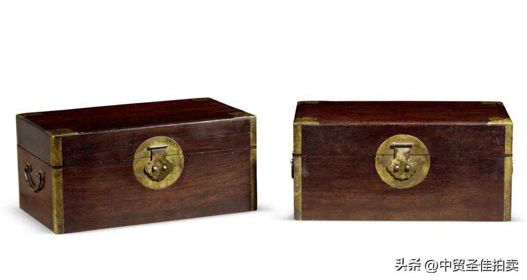 书箱成对,紫檀为材。木质坚实,紫檀表面弯曲而形似牛毛的棕眼因长期使用或存放,导管内的金星挥发呈灰白色,此时其白色的S形纹路似牛毛纹理,故称为“牛毛纹”。长方形,上开盖,盖面微隆。箱盖正面有圆形面叶及云头形拍子,立墙四角用铜叶包裹,盖顶四角镶钉如意云头纹铜饰件,盖下设平屉。箱后嵌长条合页一对,两侧按铜提环。盖从尺寸及性质来看,当时主要用来存放文件簿册或珍贵细软,故根据其功能称之为“书箱”。此对书箱造型周正,所用紫檀老料包浆厚实,可藏可宝。