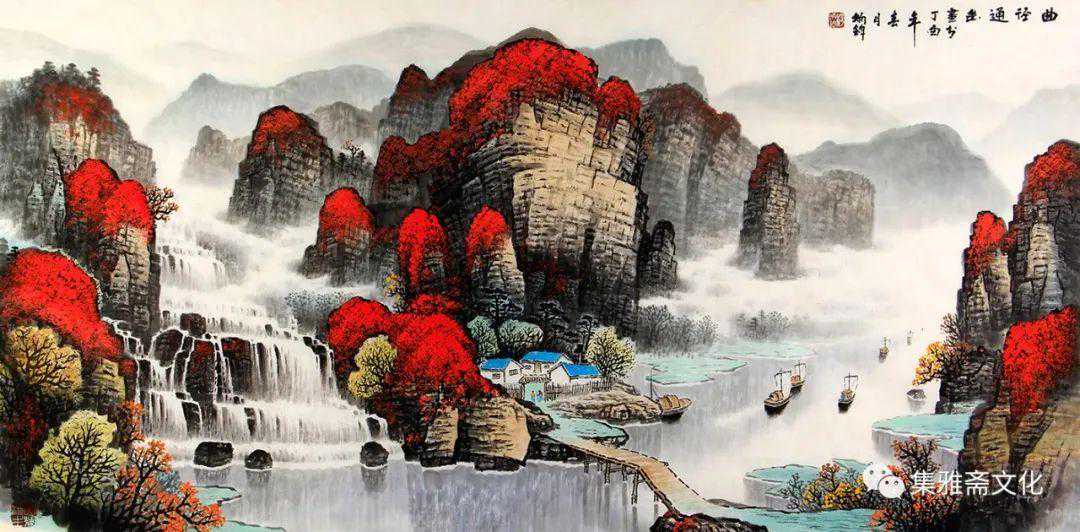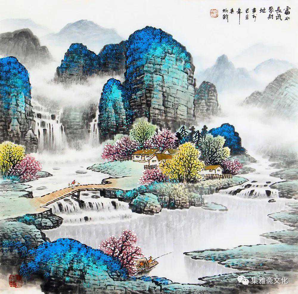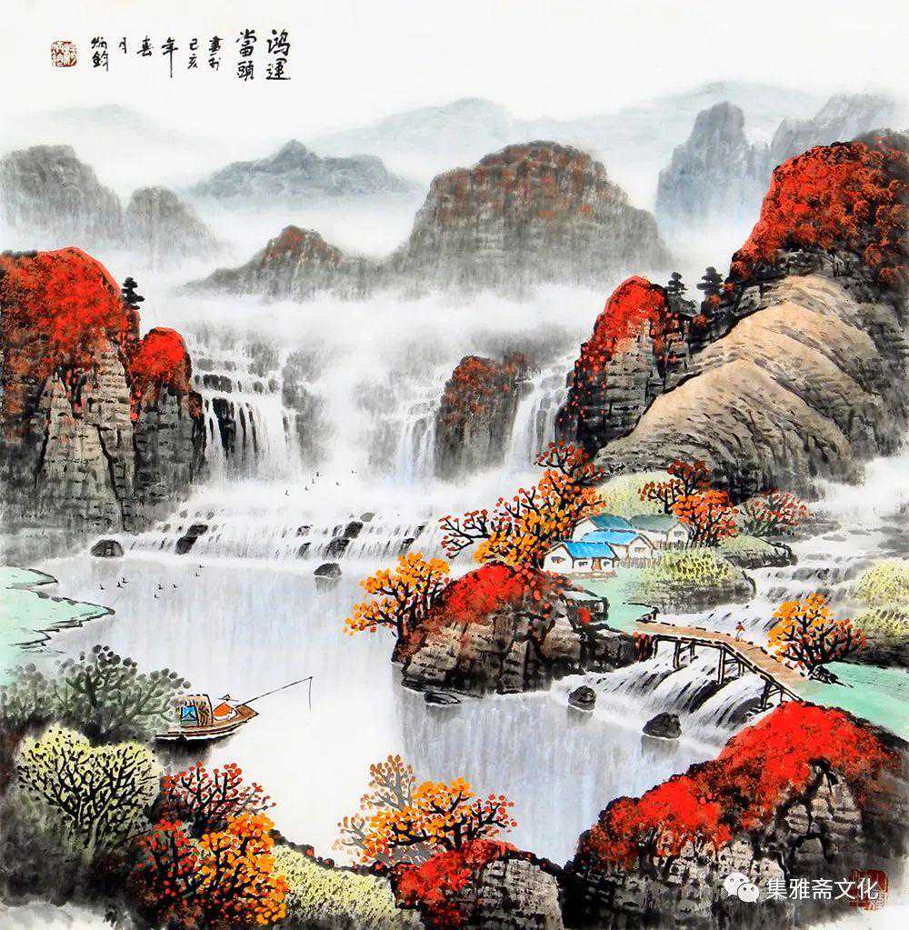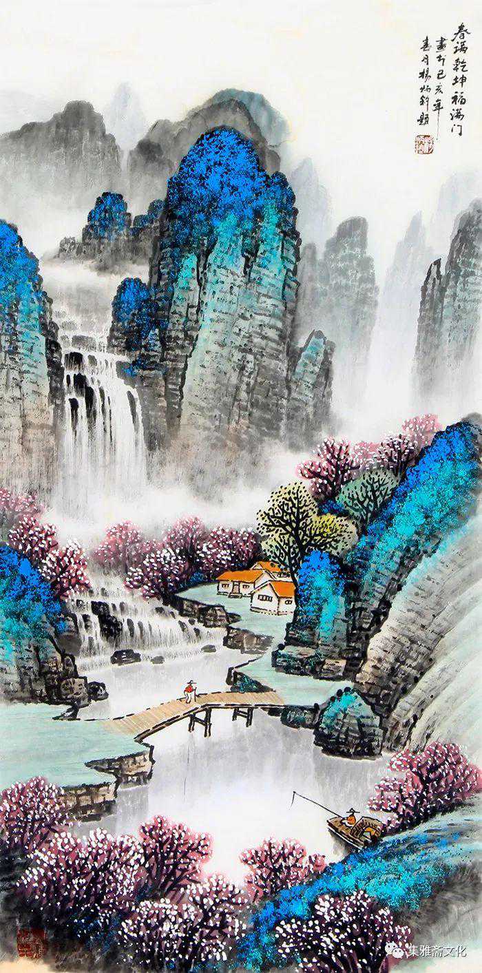杨炳钧创作的山水画,色彩鲜丽而不媚,意境深远而不晦,风格清秀而不俗,在传统的基础上融入了个性化的审美情趣,有一种扑面而来的书卷气,在画坛独树一帜。杨炳钧的山水画恰似不自觉地走了“进去”,不管是名山大川,还是小桥流水、飞泉溅瀑、村舍古寺,都是令人向往的世外桃源,自然而然地有轻松闲适之感,使得观赏者几欲走近。
