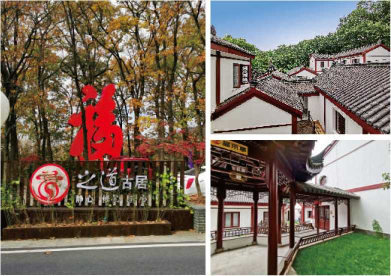 进入茅山景区,顺着景区道路前行,经过喜客泉再往上200米,路北面树林里竖立着一个近5米高的大红色“福”字,“福”字的旁边就是别具特色的养心民宿一一茅山•之道亲子温泉民宿。