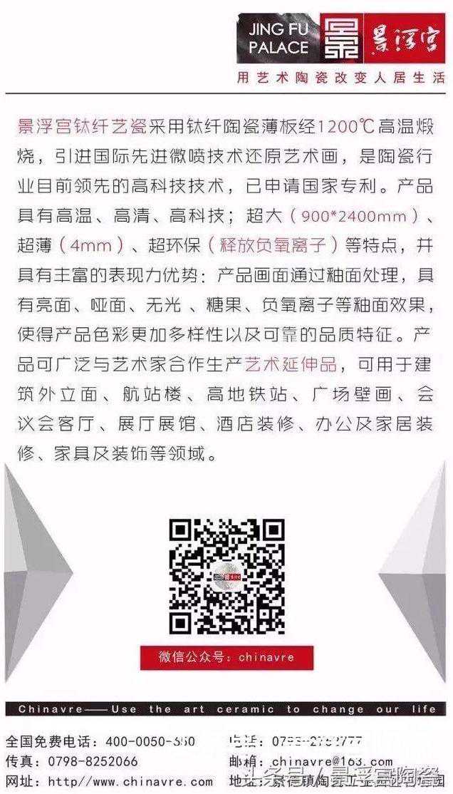景德镇景浮宫陶瓷文化有限公司创建于2013年7月,是一家集研发、生产、销售为一体的新型艺术陶瓷文化企业。以弘扬“中国陶瓷文化艺术”为己任,依托千年瓷都景德镇深厚的陶瓷文化底蕴和手工制瓷工艺,携手中国美院、景德镇陶瓷大学以钛纤陶瓷薄板为载体,成功地运用世界领先的陶瓷微喷技术,开发出了具有独创性的陶瓷薄板艺术产品——钛纤艺瓷,并于2015年12月获得中华人民共和国国家知识产权局授权发明专利(专利号:)。