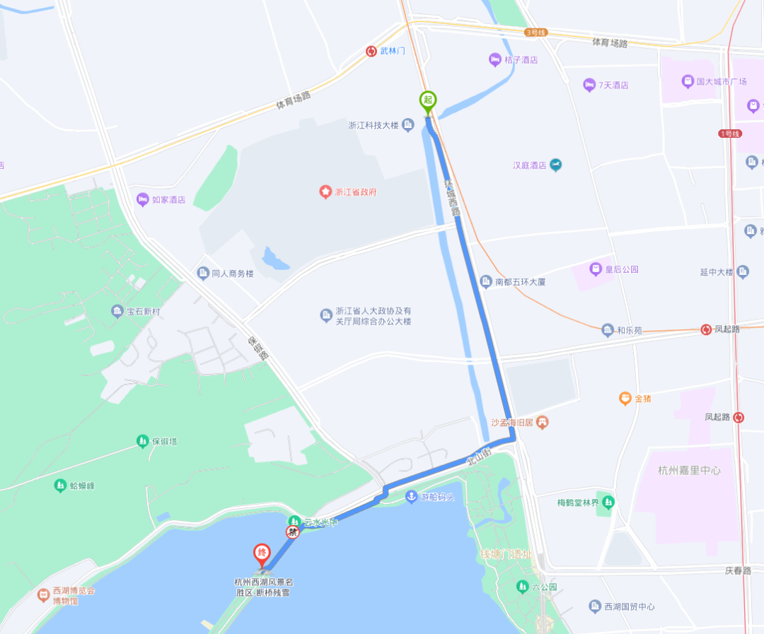 途经曙光路、保俶路约2公里(可选择骑行)
