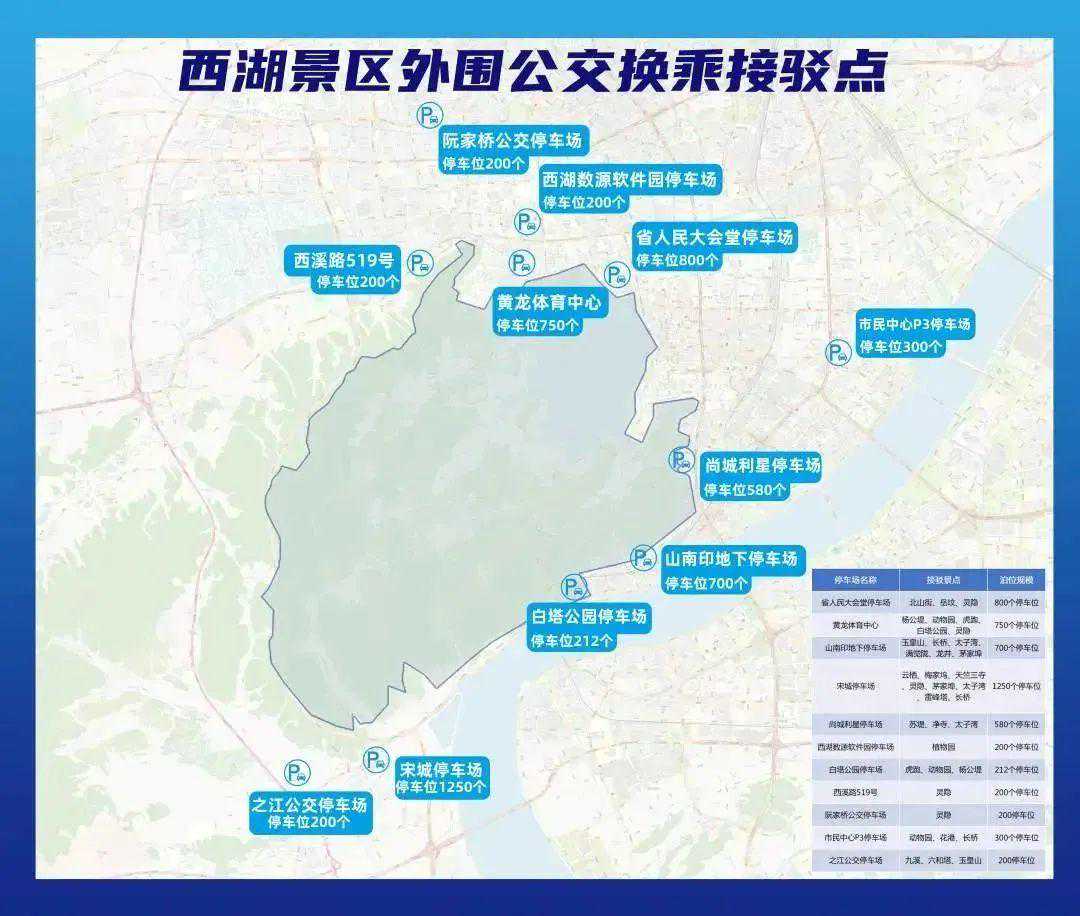西湖景区外围的11个停车场(黄龙体育中心停车场、省人民大会堂停车场、尚城利星停车场、山南印停车场、阮家桥公交停车场、宋城停车场、西湖数源软件园停车场、之江公交停车场、白塔公园停车场、西溪路519号停车场、市民中心P3停车场)也将在“五一”期间,开通景区换乘线。