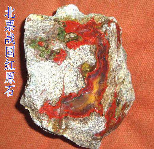 当今大热玛瑙料石之一,最早产地为辽宁北票市,因在辽西地区战国古墓中发现过此类玛瑙所做的玉璧得名。多以火山岩包裹玛瑙带,大料甚少,颜色以红黄为主,偶有白色,缟纹也出画面。后又在河北宣化市发现类似玛瑙,曰宣化战国红或蒙料战国红。原石以小火山弹呈现,整料较多,逊色于北票战国红。最近又见外蒙古发现类似宣化战国红的玛瑙,命名外蒙战国红。